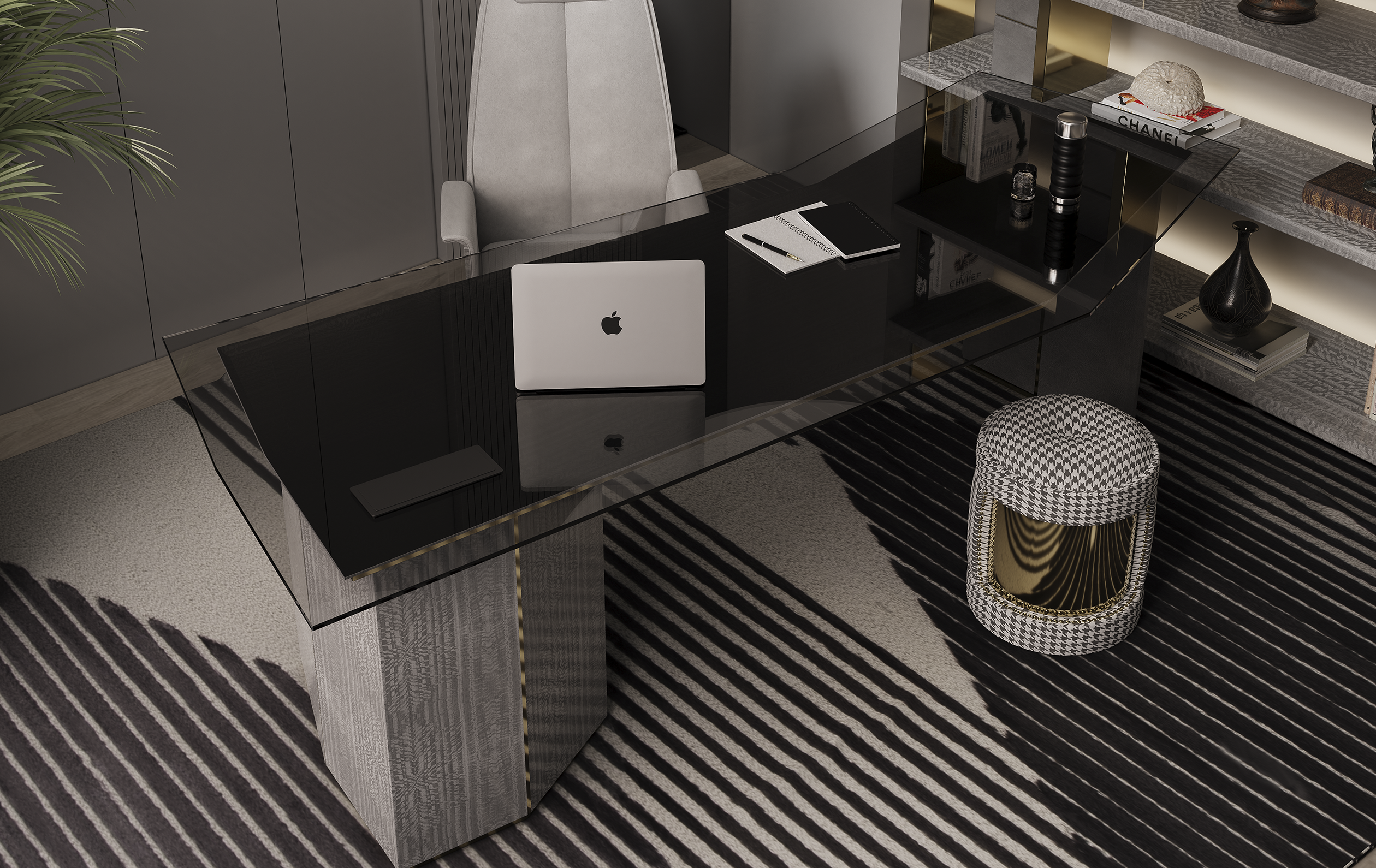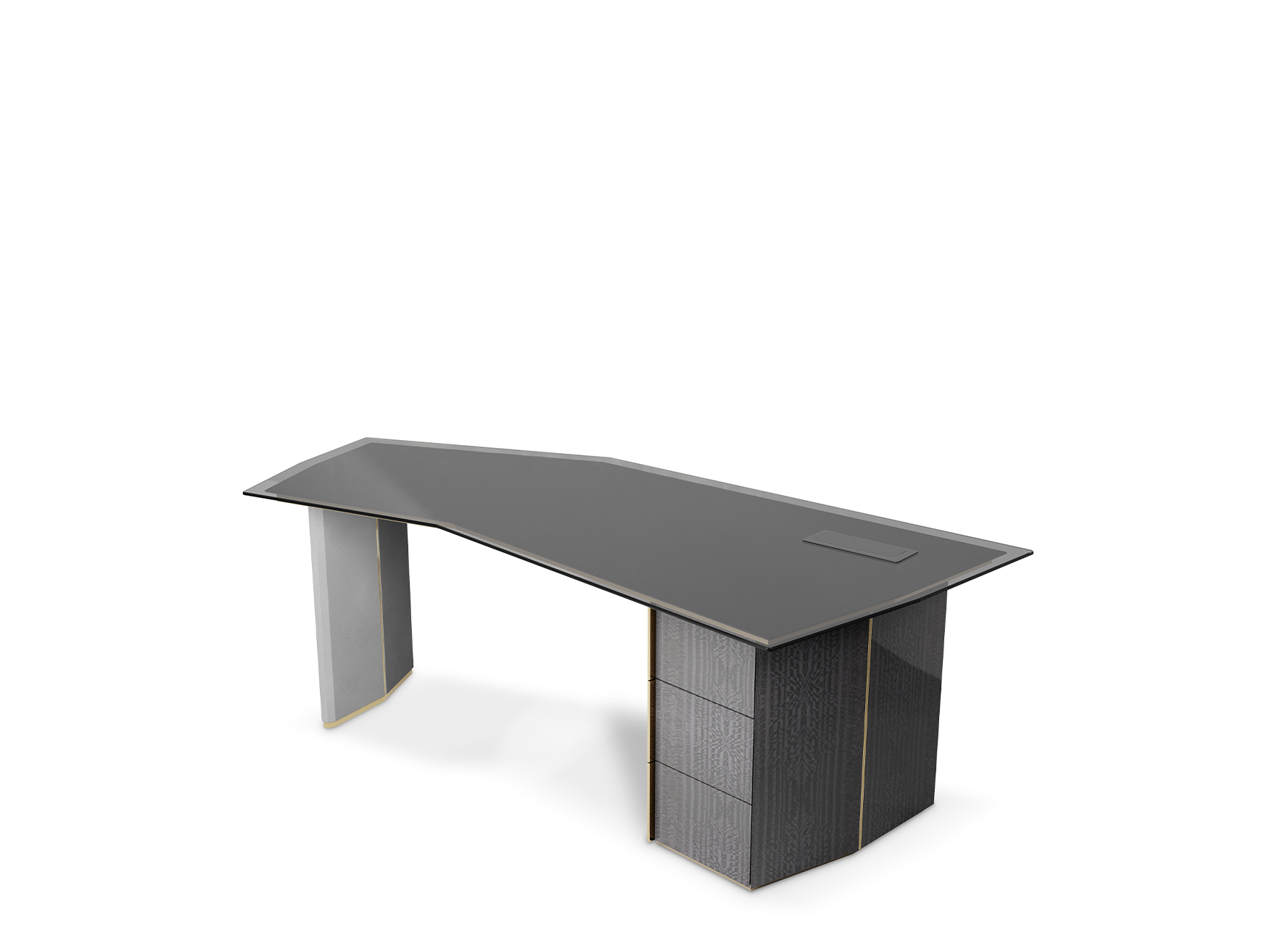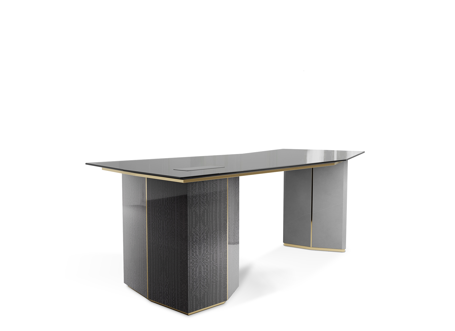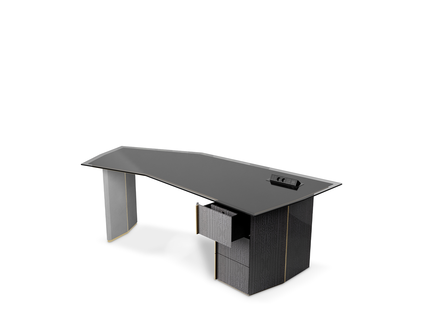 The Algerone Desk seamlessly blends technology and modern design. It features an electrical socket, a USB charging port, and an RJ45 connector to meet all connectivity needs. But there's more: it's crafted with precision using grey Eucalyptus Frisé, grey leather, and smoked glass, making it not just a workstation but also a piece of art with unique polished brass lines elegantly contouring its design, enhancing any office decor.