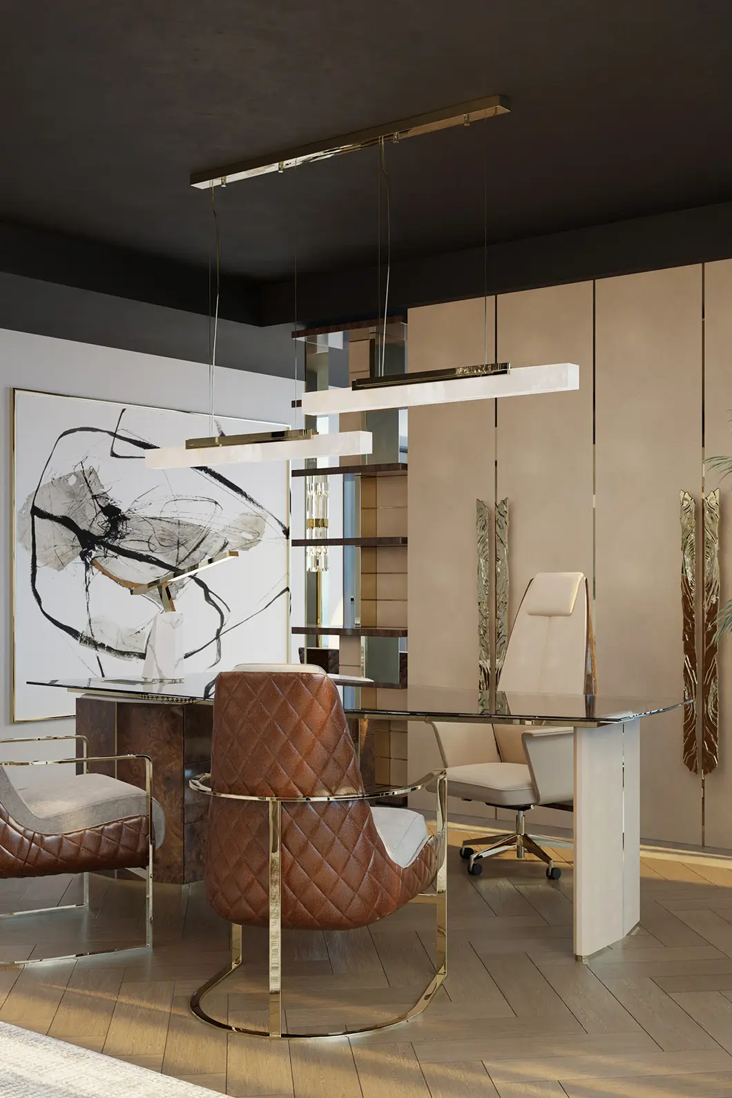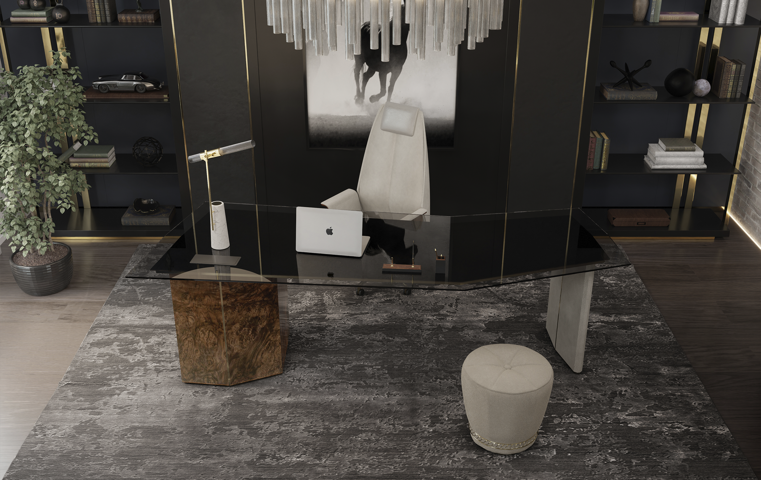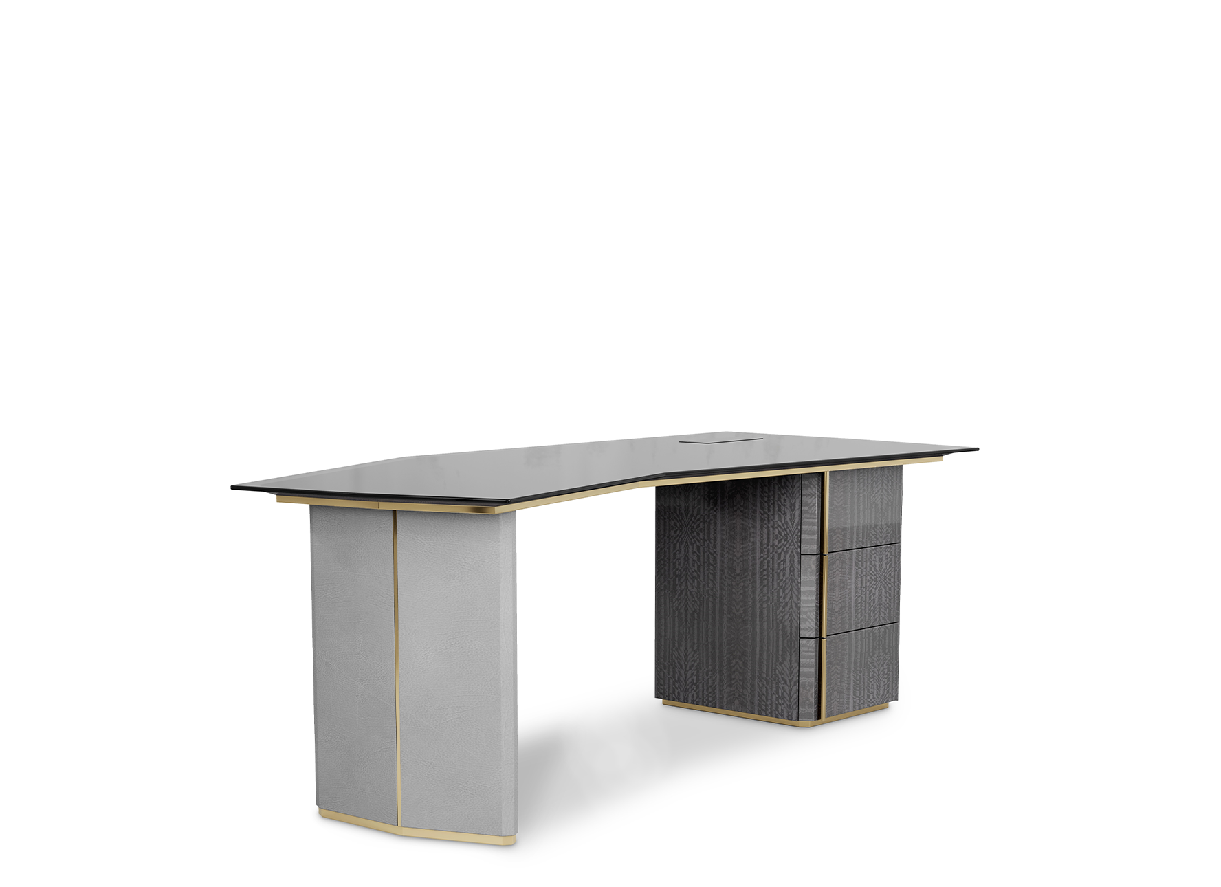 The Algerone Desk seamlessly blends technology and modern design. It features an electrical socket, a USB charging port, and an RJ45 connector to meet all connectivity needs. But there's more: it's crafted with precision using grey Eucalyptus Frisé, grey leather, and smoked glass, making it not just a workstation but also a piece of art with unique polished brass lines elegantly contouring its design, enhancing any office decor.