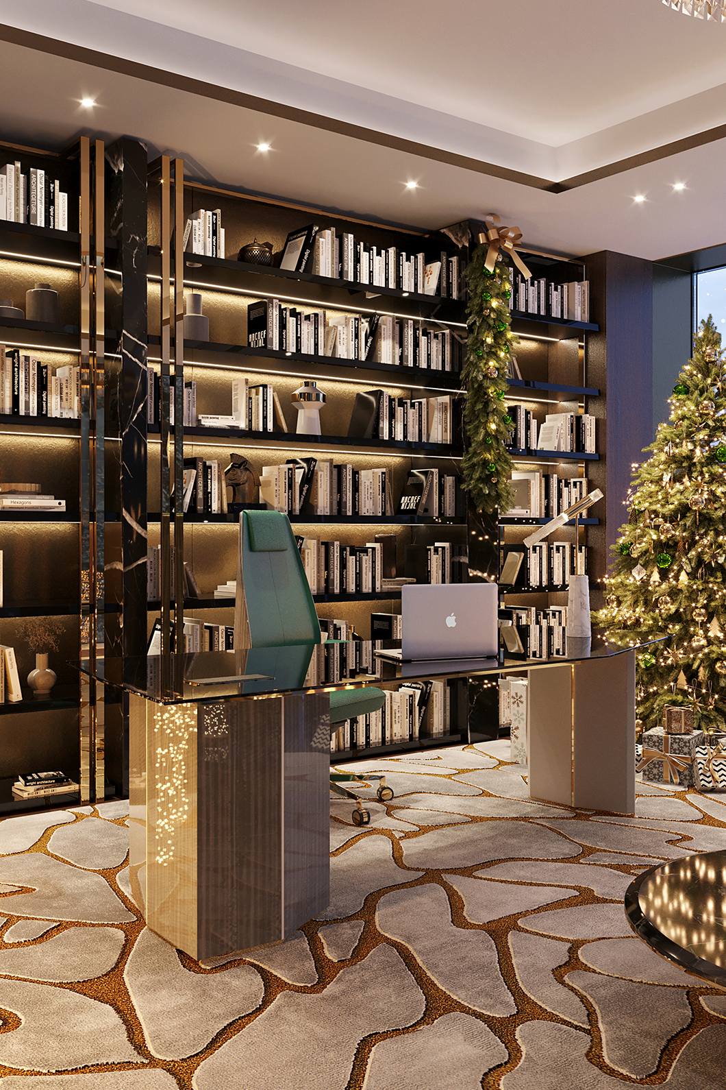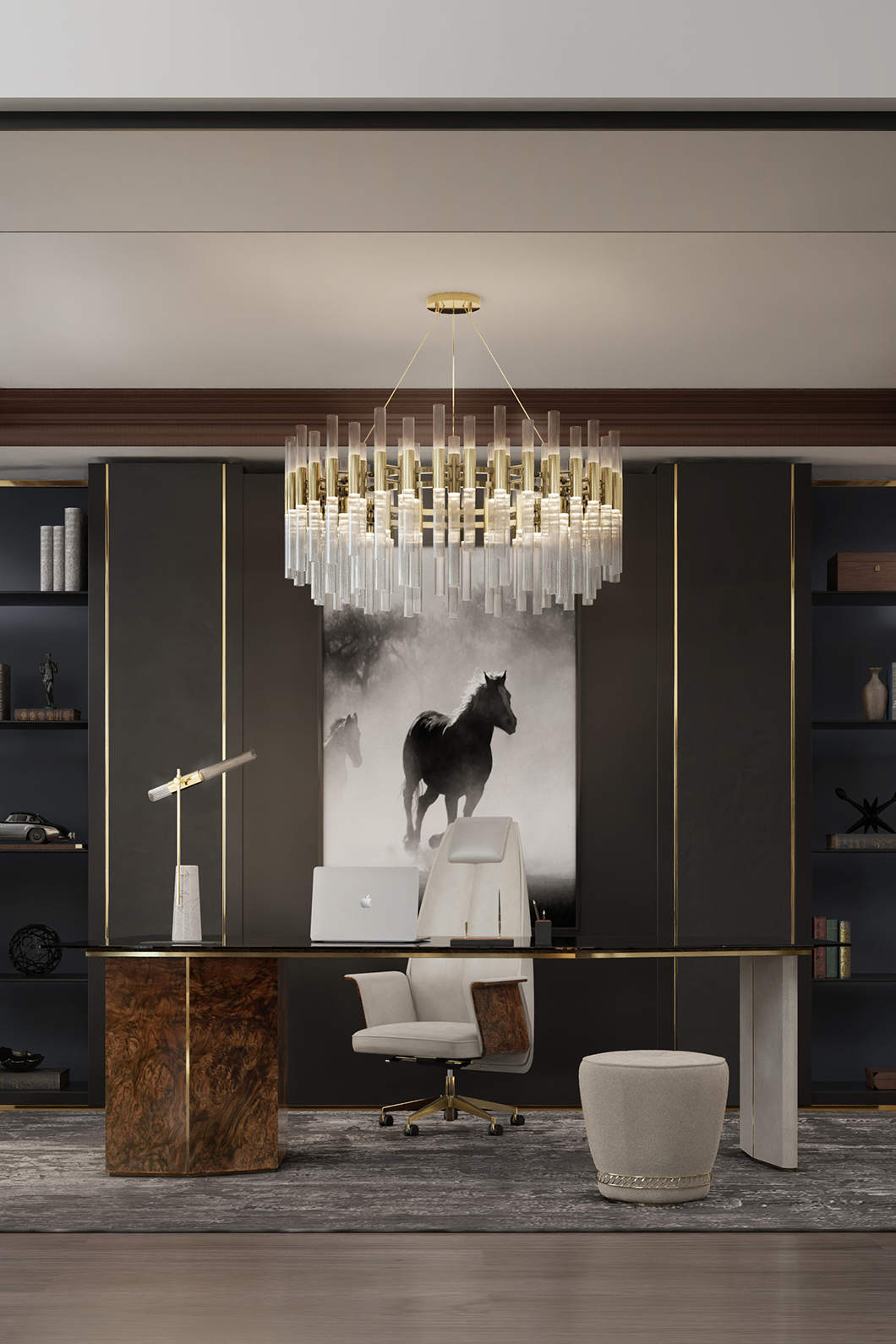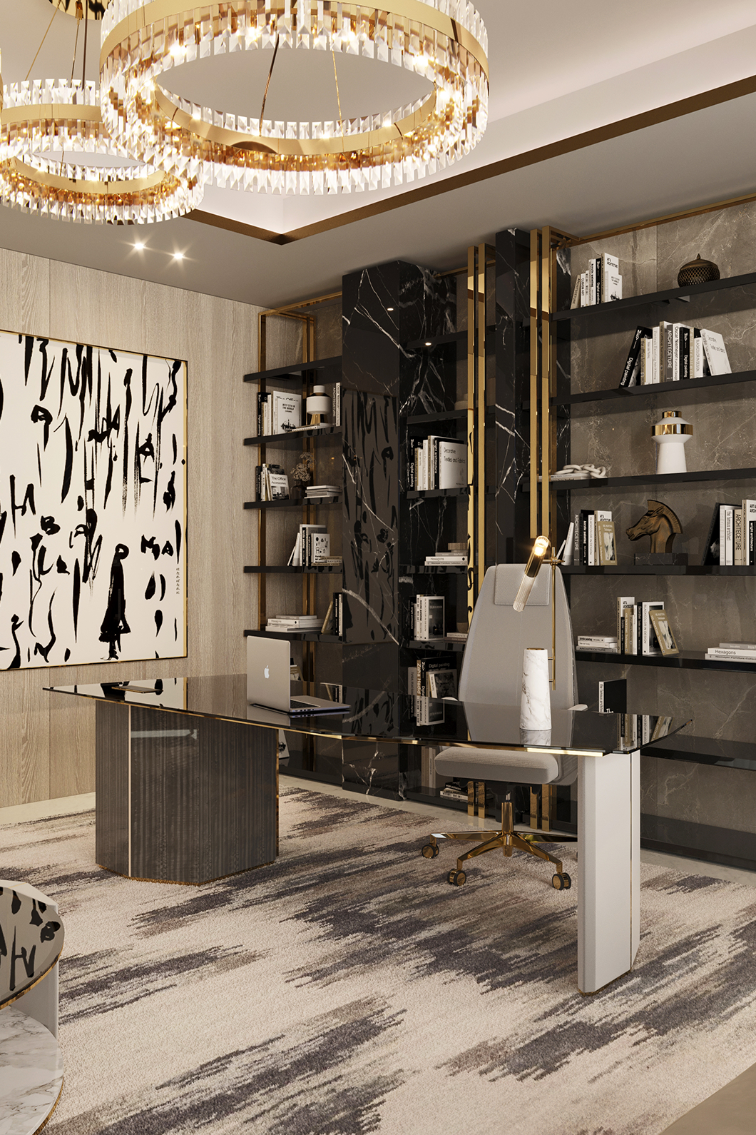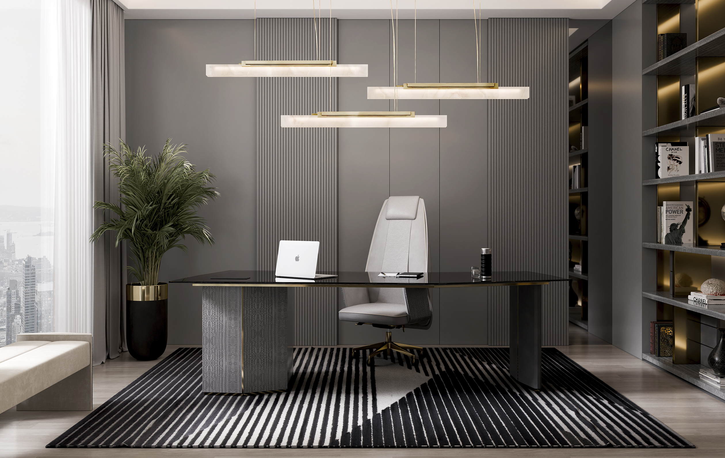 The Algerone Desk seamlessly blends technology and modern design. It features an electrical socket, a USB charging port, and an RJ45 connector to meet all connectivity needs. But there's more: it's crafted with precision using grey Eucalyptus Frisé, grey leather, and smoked glass, making it not just a workstation but also a piece of art with unique polished brass lines elegantly contouring its design, enhancing any office decor.