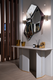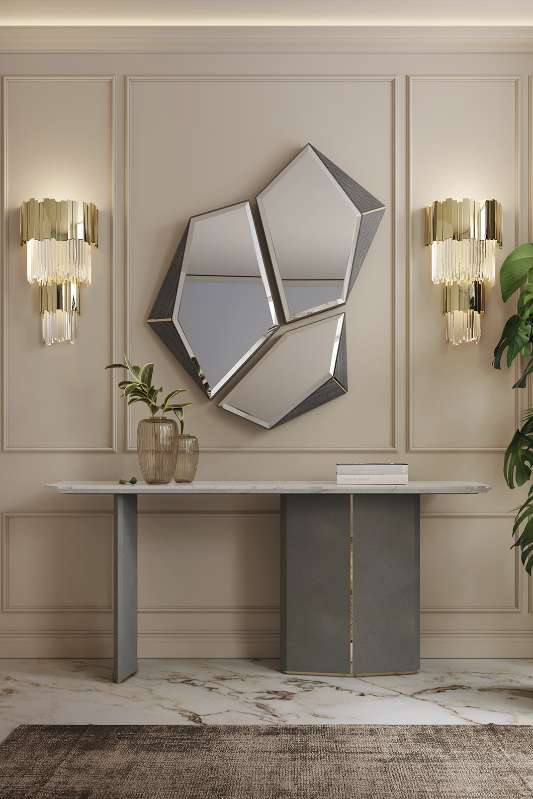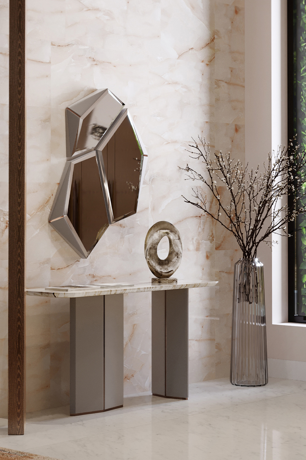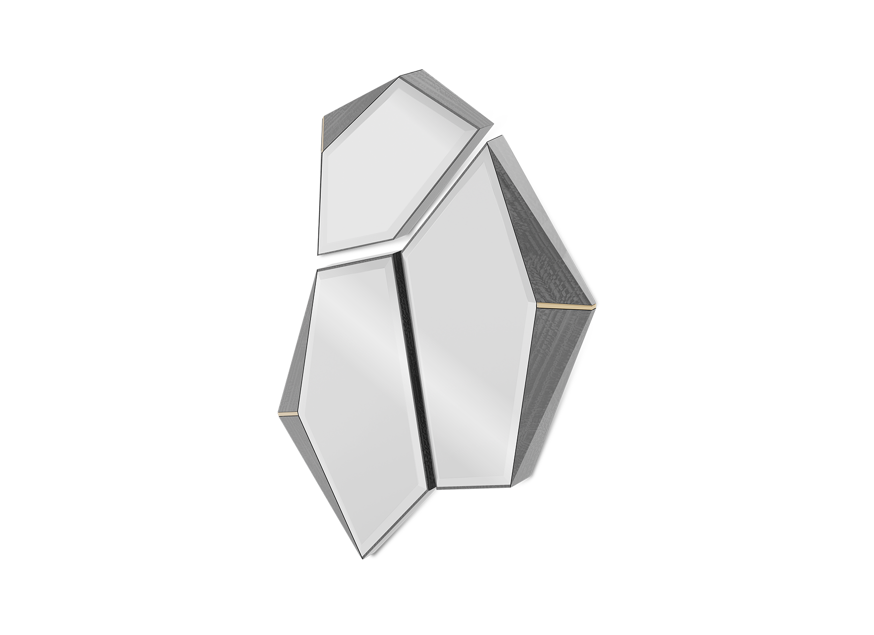 Divided into three asymmetrical frames, the fragmented form of the Algerone Mirror was designed to convey a more peculiar aesthetic that adds depth and interest to any space it bestows. Each frame is boarded with Eucalipto Frise veneer and brass details that further complement the mirror’s ornamental appeal.