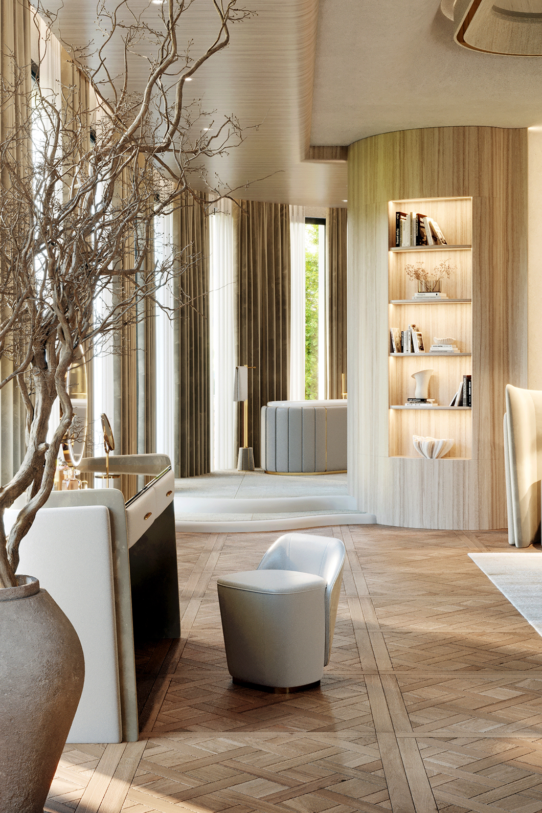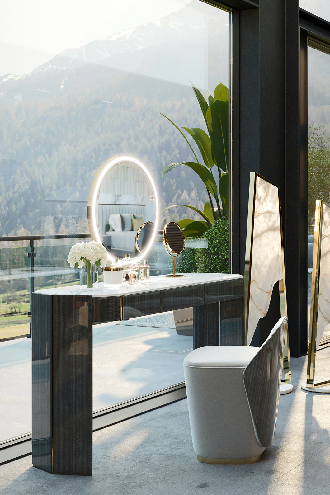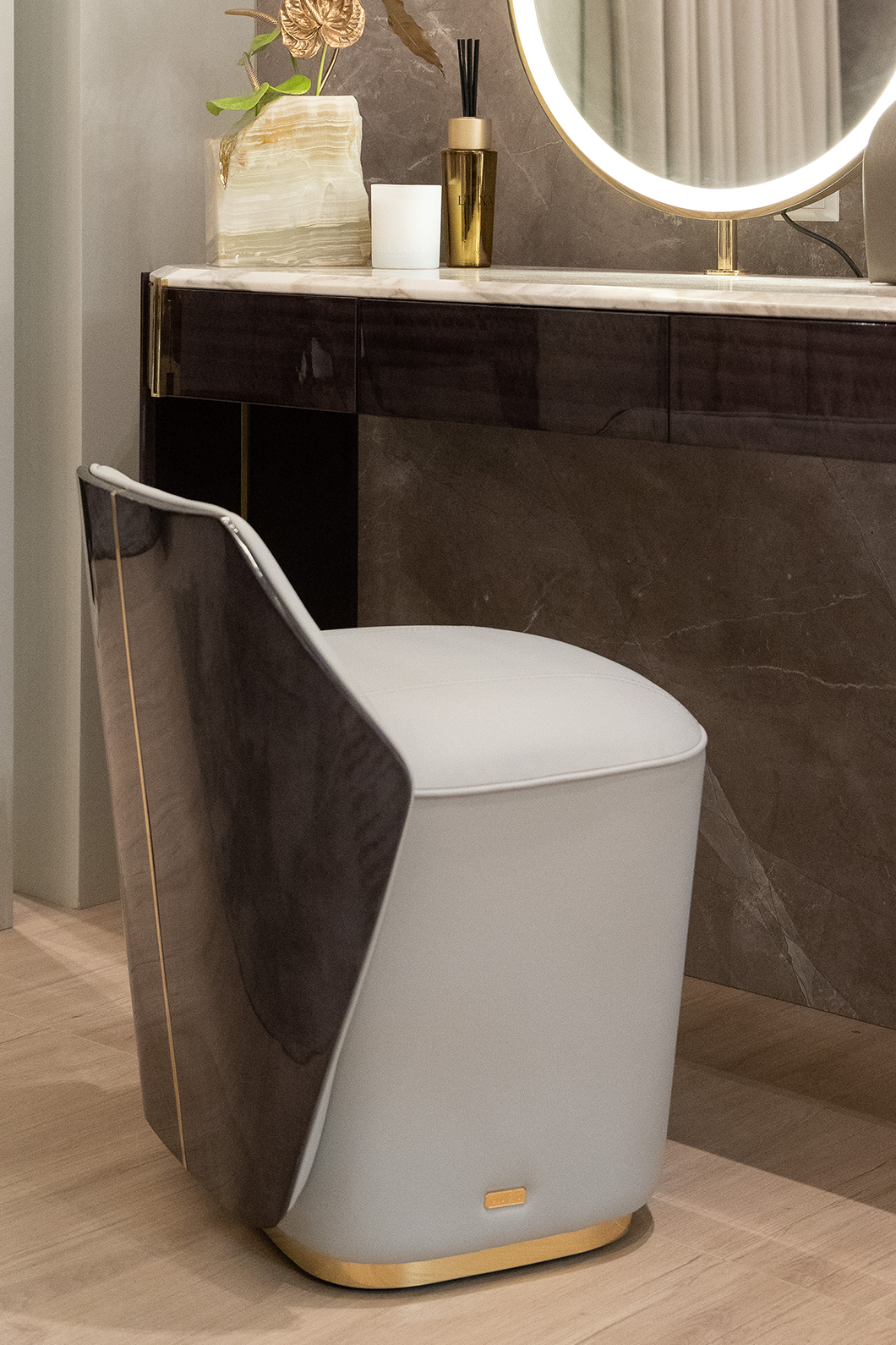 Body: Polished Brass, Gray Leather & Glossy Eucalipto Frise Veneer