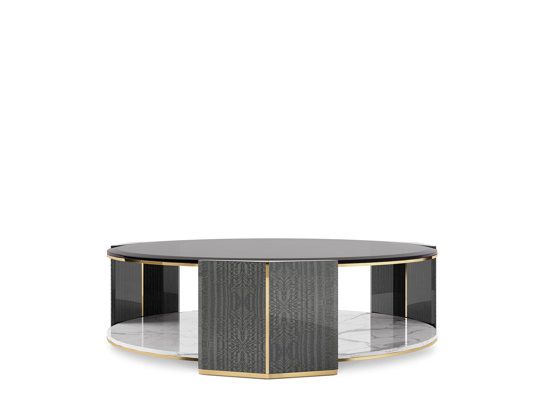 The Algerone Wood large center table is now available as a standalone piece. This elegant table is crafted from polished brass, glossy grey Eucalyptus Frisé veneer, smoked glass, and Statuario marble, combining modern design elements with luxurious materials. It is an ideal addition to stylish living rooms, offering a refined and sophisticated touch to any interior decor.