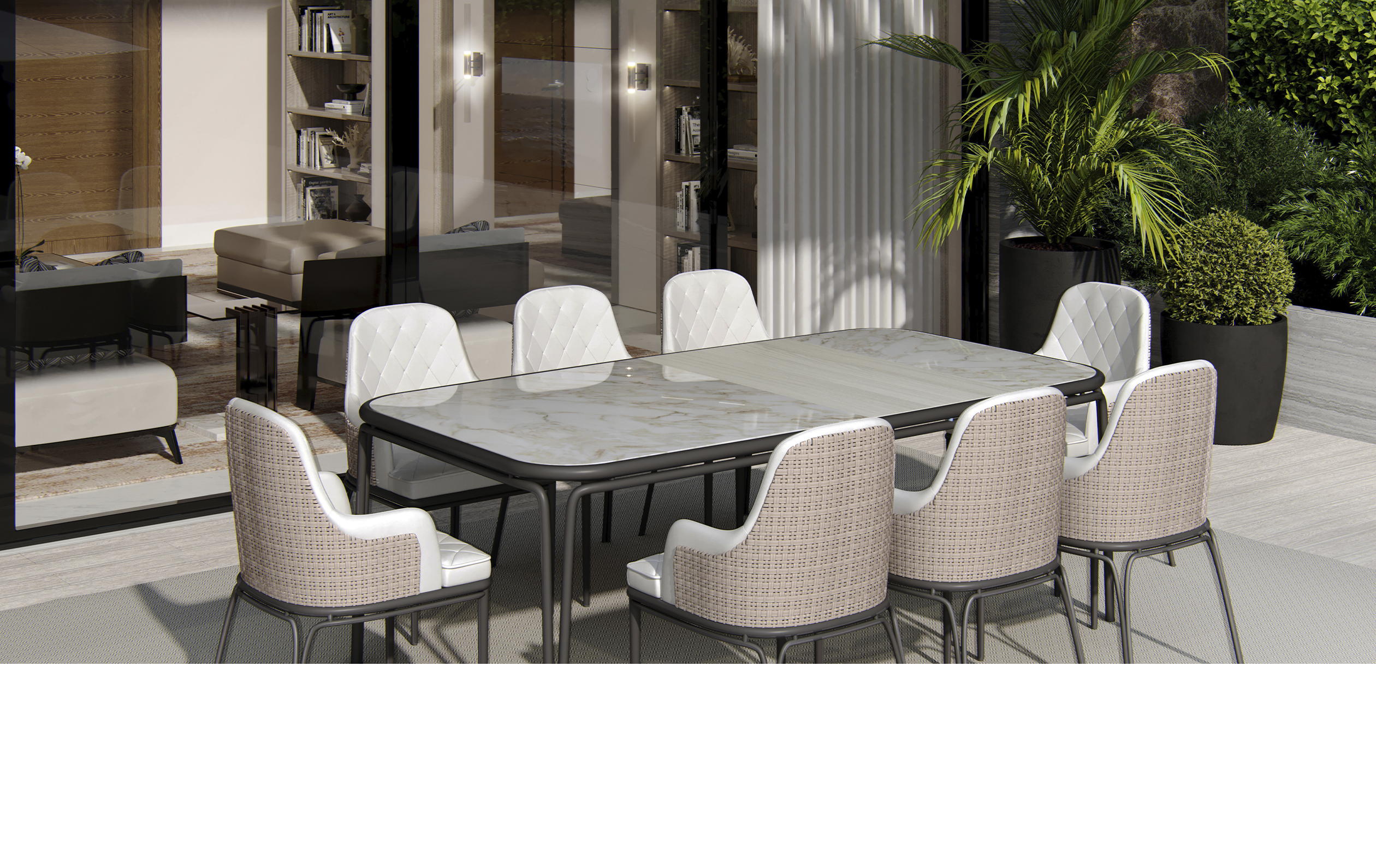 The Charla Outdoor Dining Table is an exceptional piece of furniture that harmoniously blends the finest hand-crafted Teka wood with the inviting golden tones of its Calacatta Gold marble surface. Its stunning design makes it a perfect fit for any modern outdoor dining area