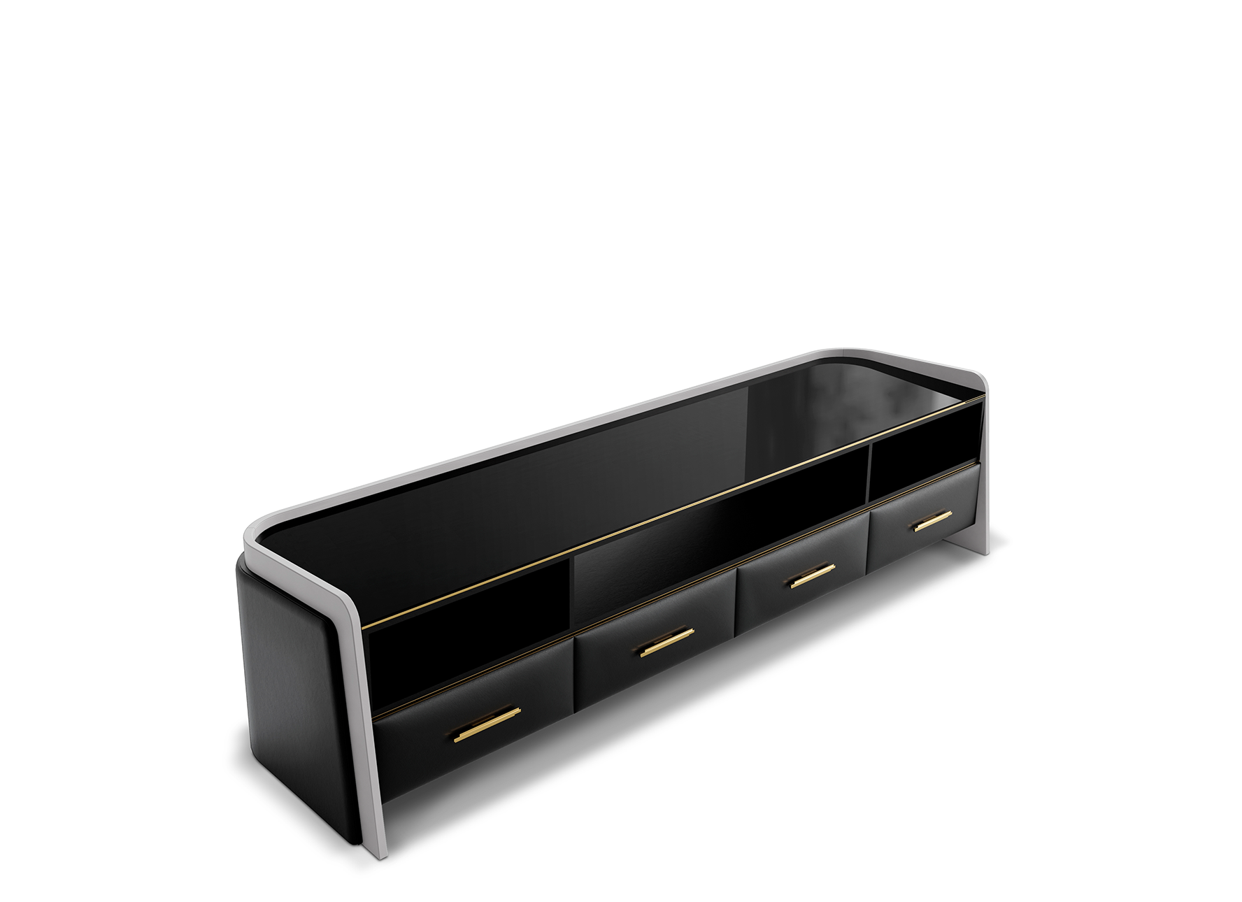 The Charla TV cabinet becomes the new essential classic for your living room. Functional and sophisticated, this supportive piece offers plenty of storage room, with four drawers upholstered in beige Nata leather, and grey leather adds a lavish touch to its back and lateral surfaces. Charla is a tasteful and daring piece with a modern identity!