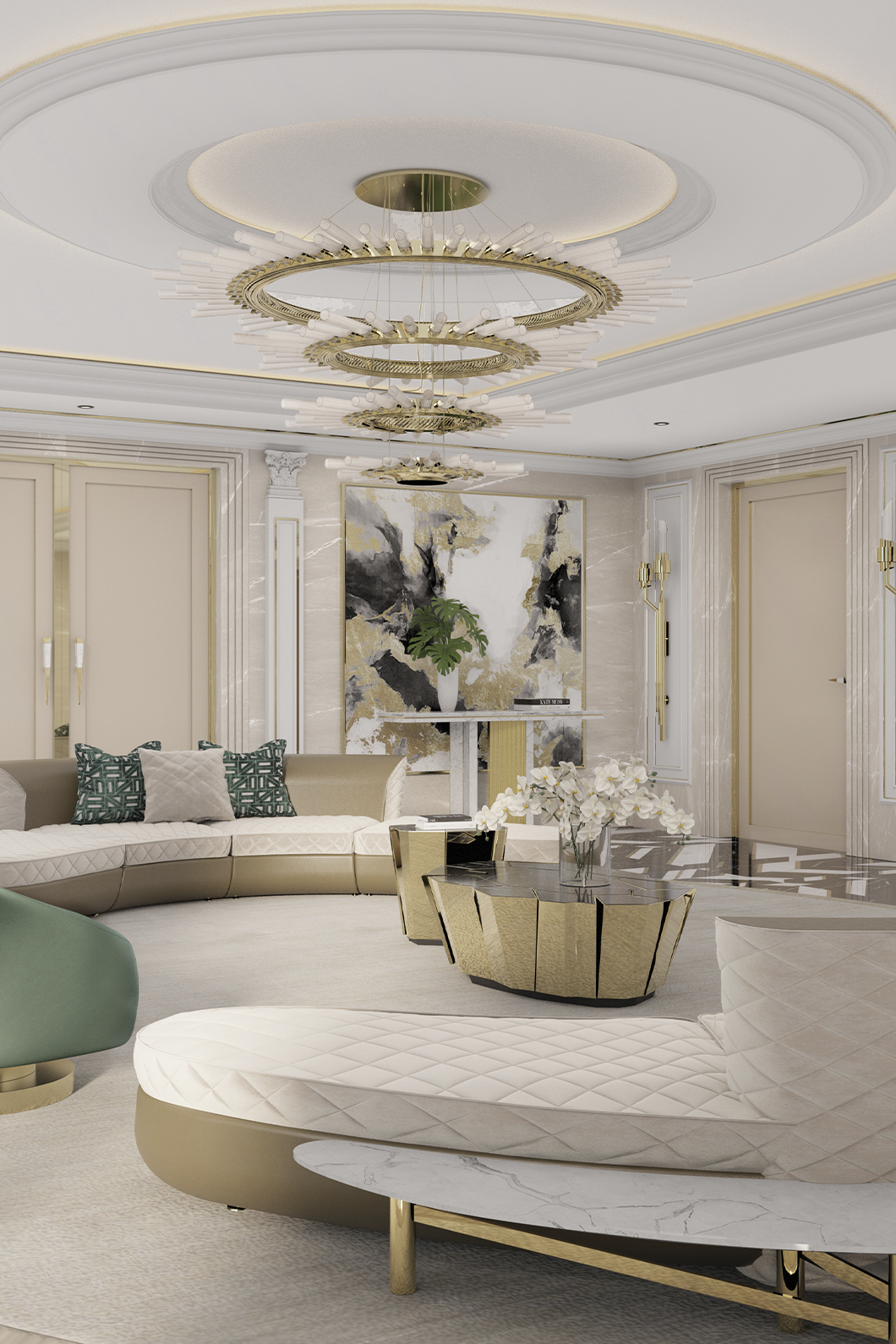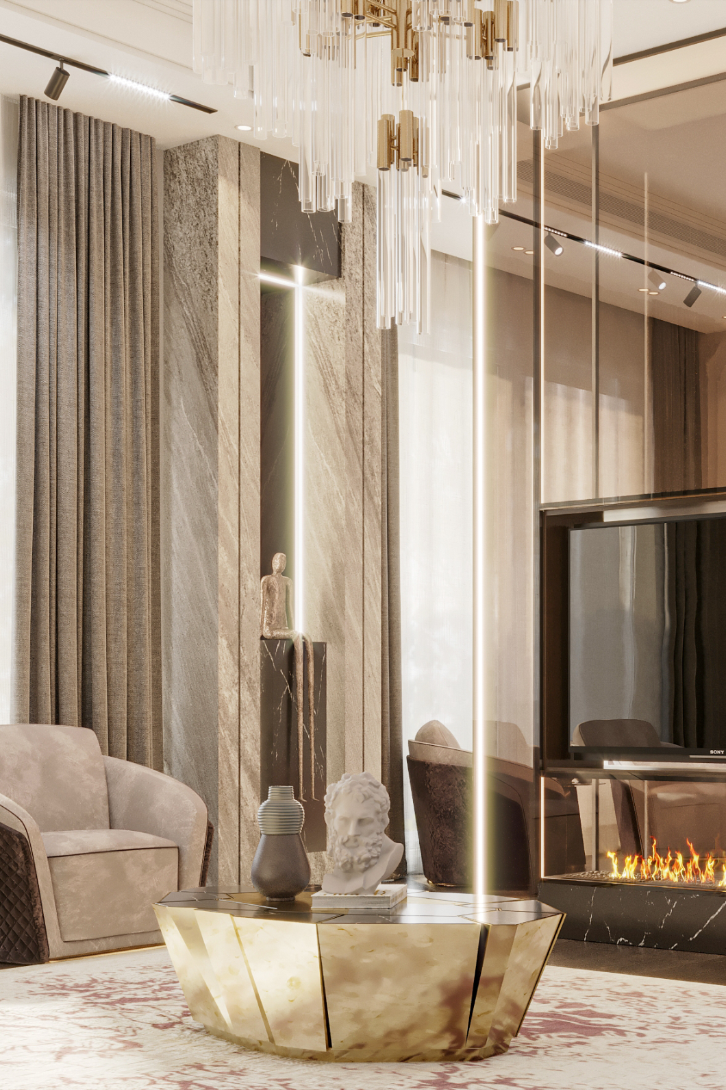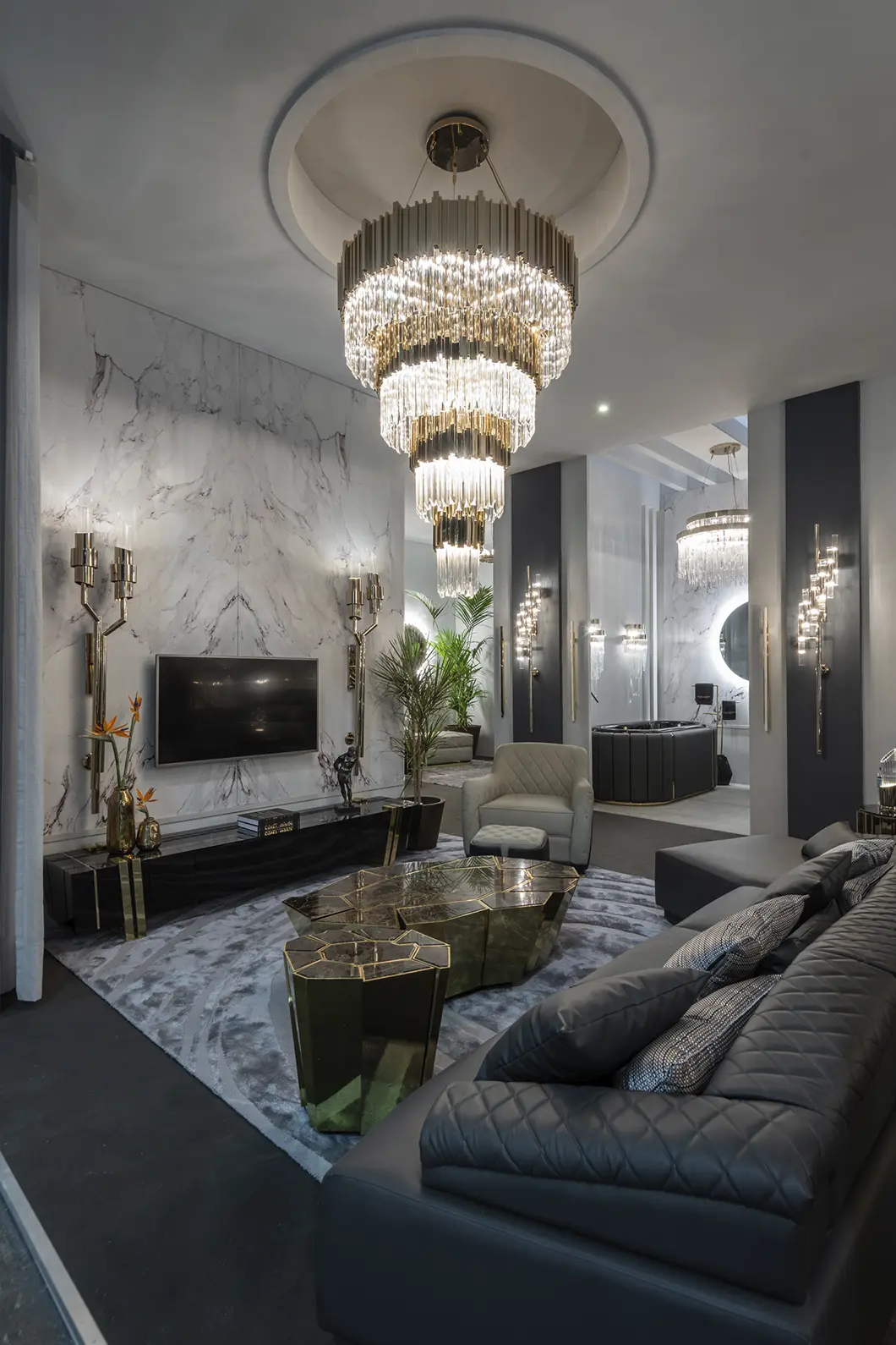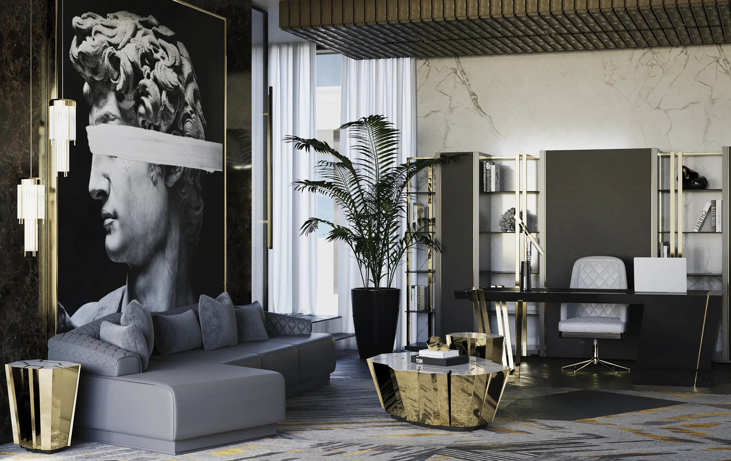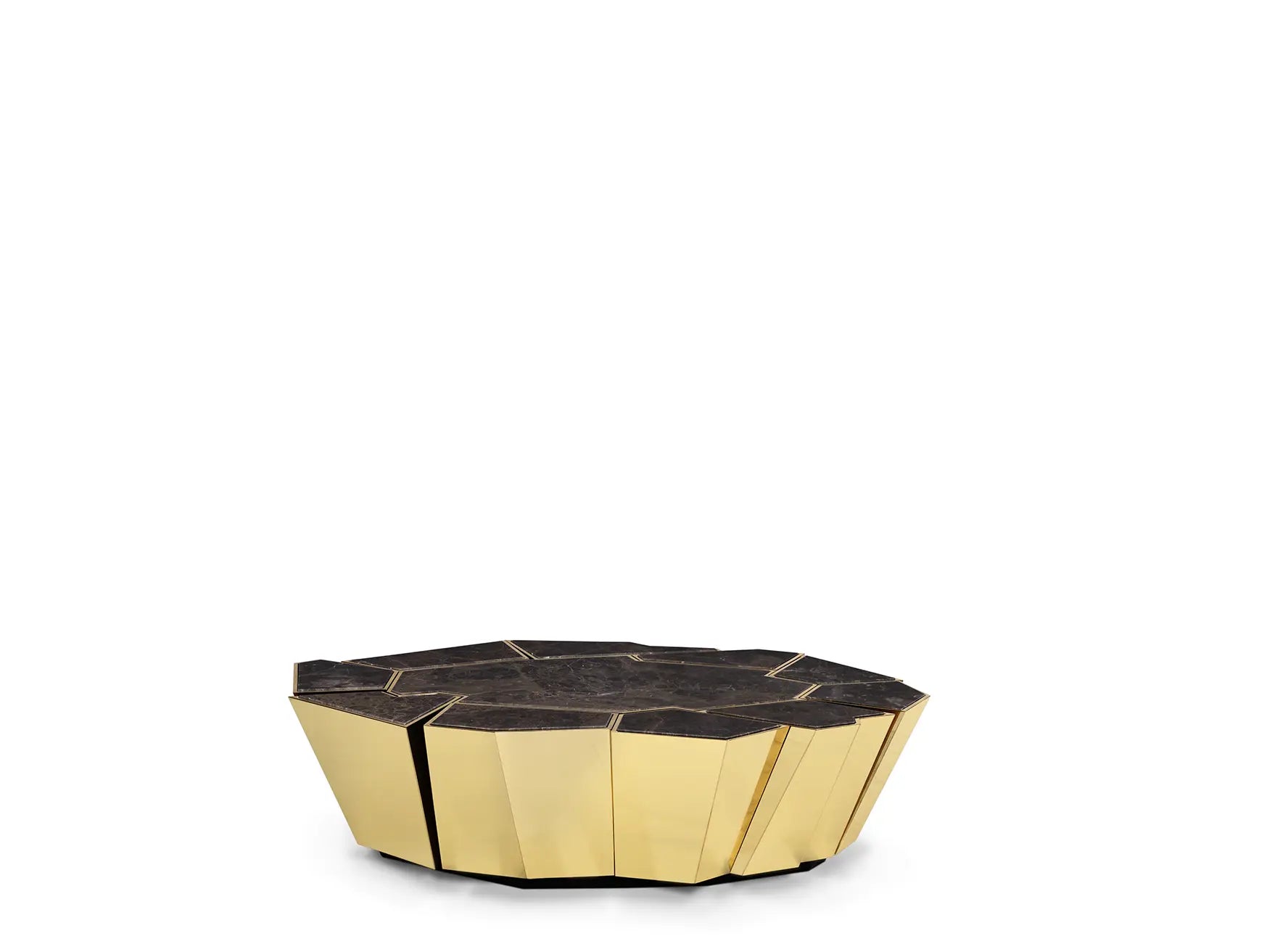 Following the same inspirational lines as the Crackle collection, this modern center table stands out for the complexity of the manual work on the brass and the technique used to apply the walnut root veneer. Whether placed in a hotel lobby or as a centerpiece in a cozy living room, this versatile table exudes elegance and functionality.