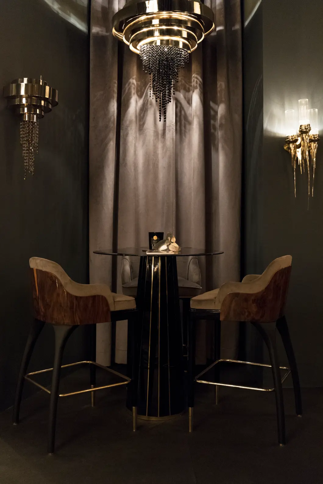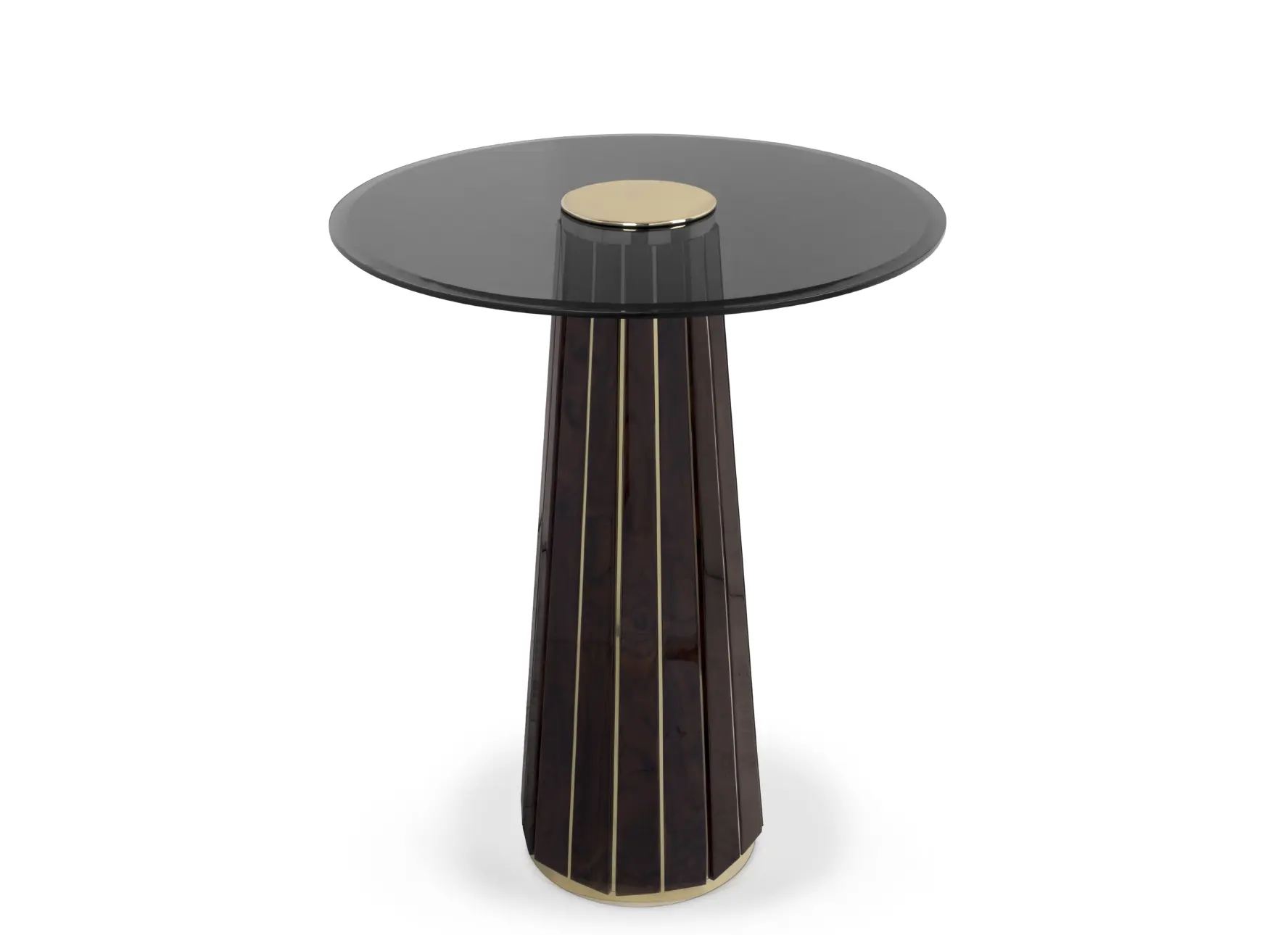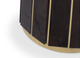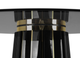 The Darian Bar Table draws inspiration from the strength of a shield and embodies luxury in its design, making it an ideal choice for high-end projects such as bars, lobbies, or cocktail lounges. With a wooden structure adorned with polished brass bars and a round top made of smoked glass, this table exudes elegance and sophistication.