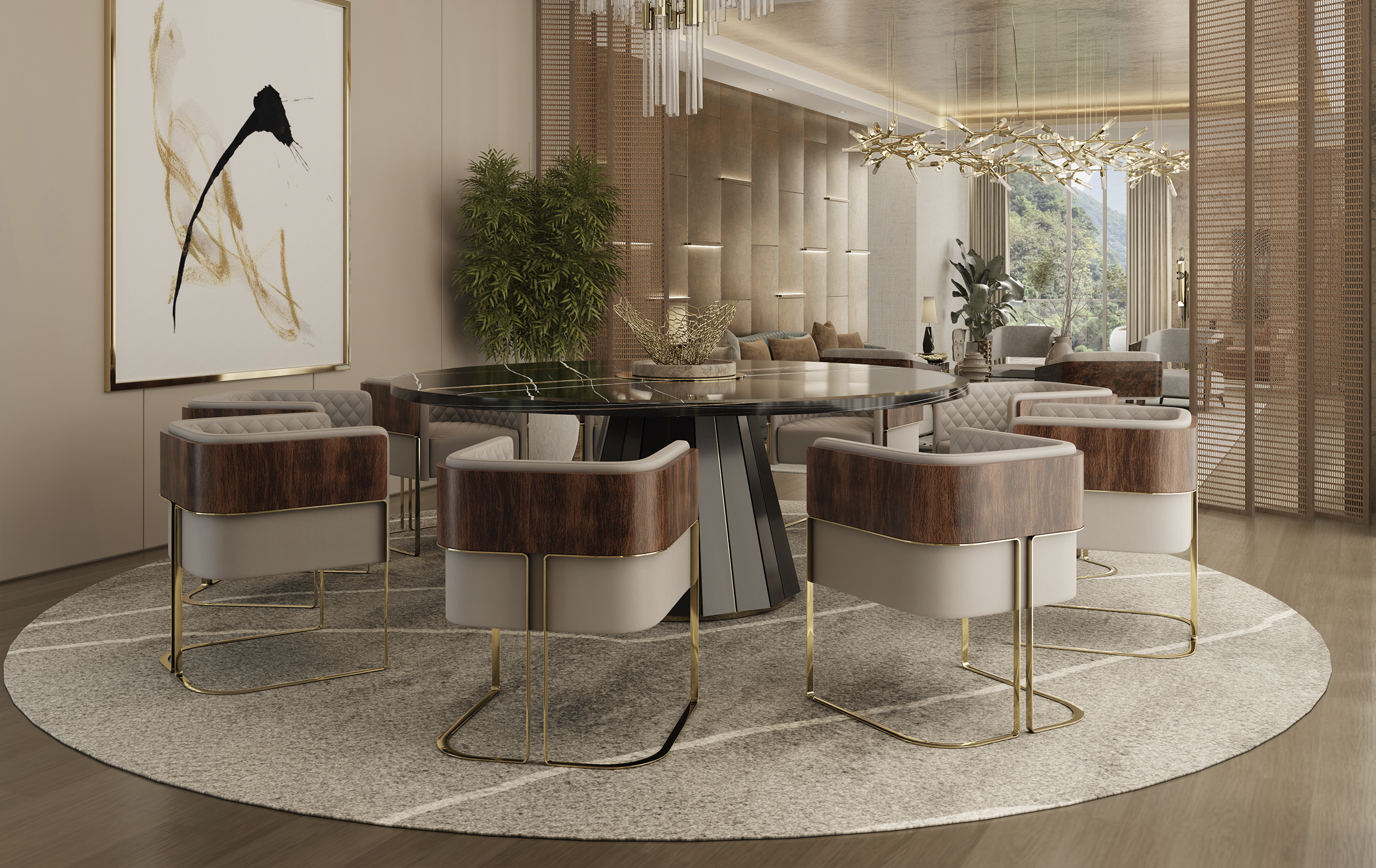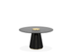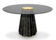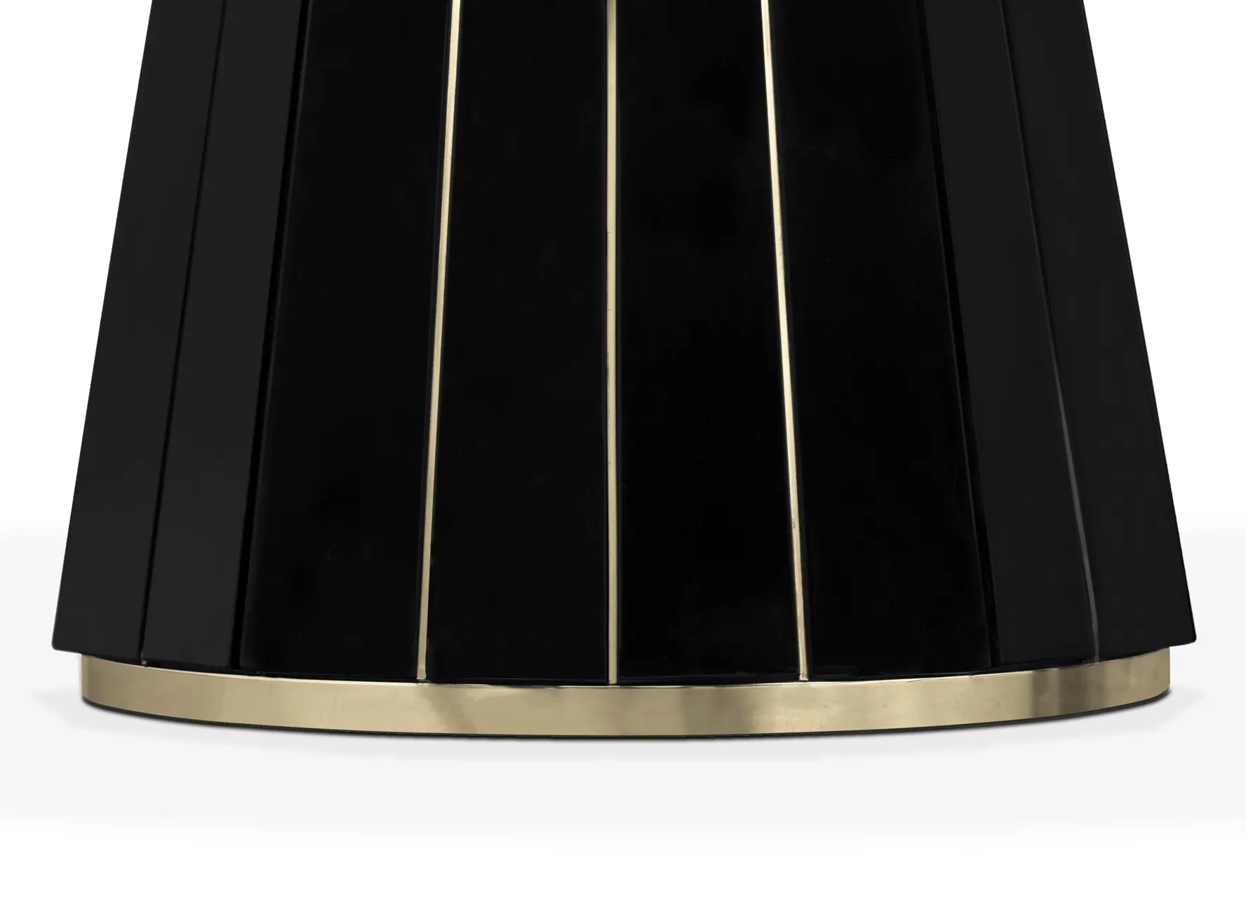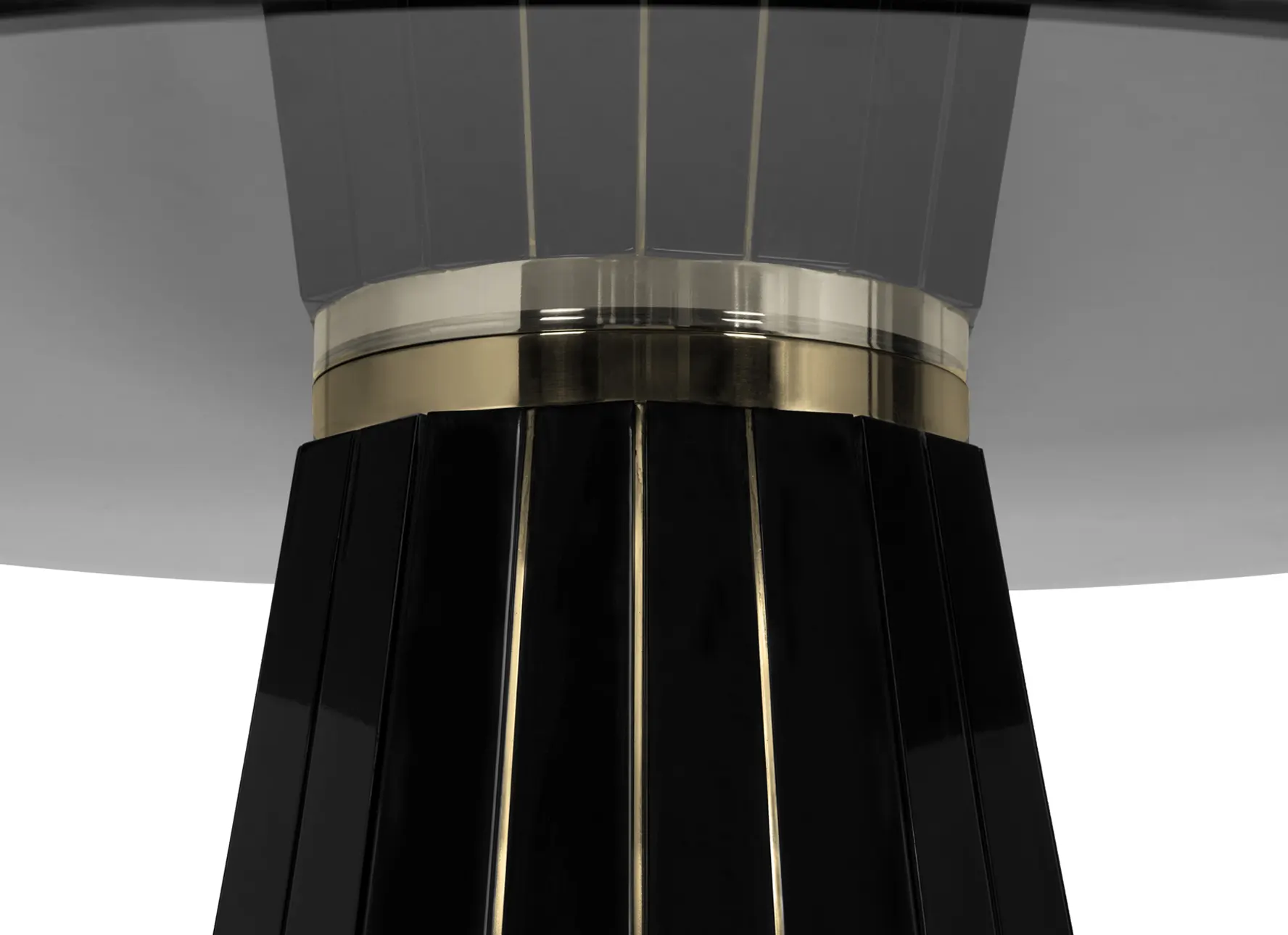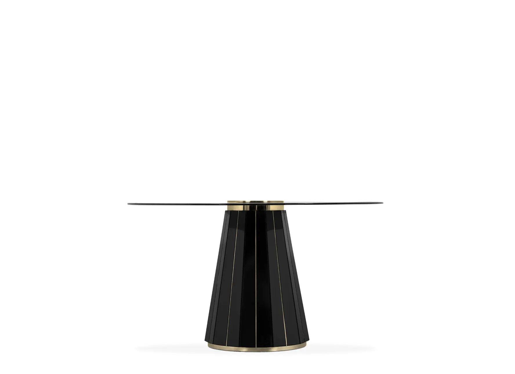 The Darian Dining Table gets its inspiration from the prodigious Darian Sideboard. This exquisitely handcrafted round table features a smoked glass top resting upon a wooden structure in black lacquer, adorned with polished brass bars.