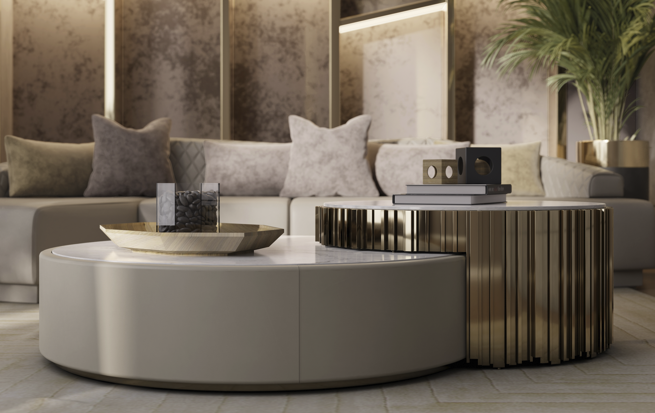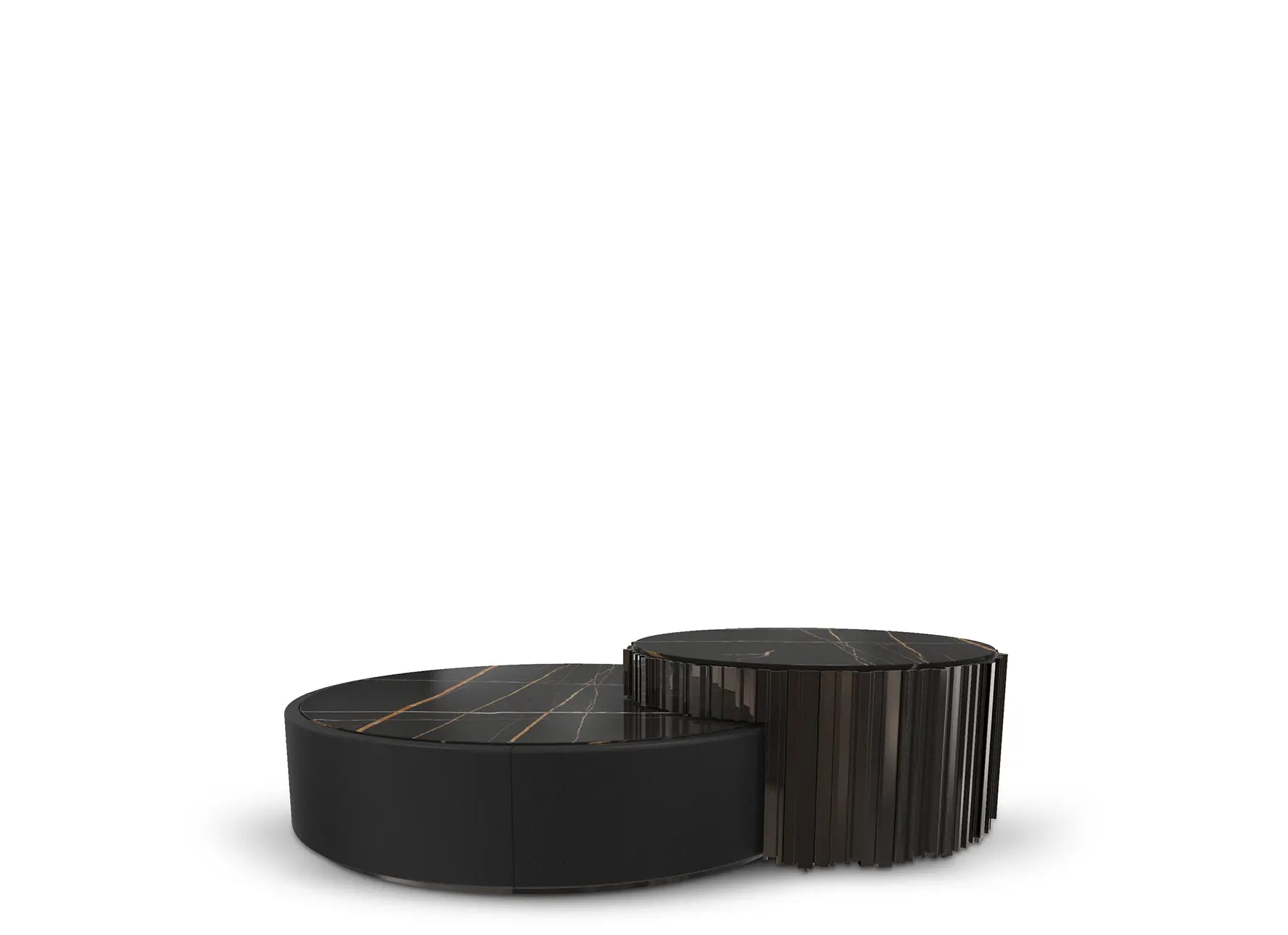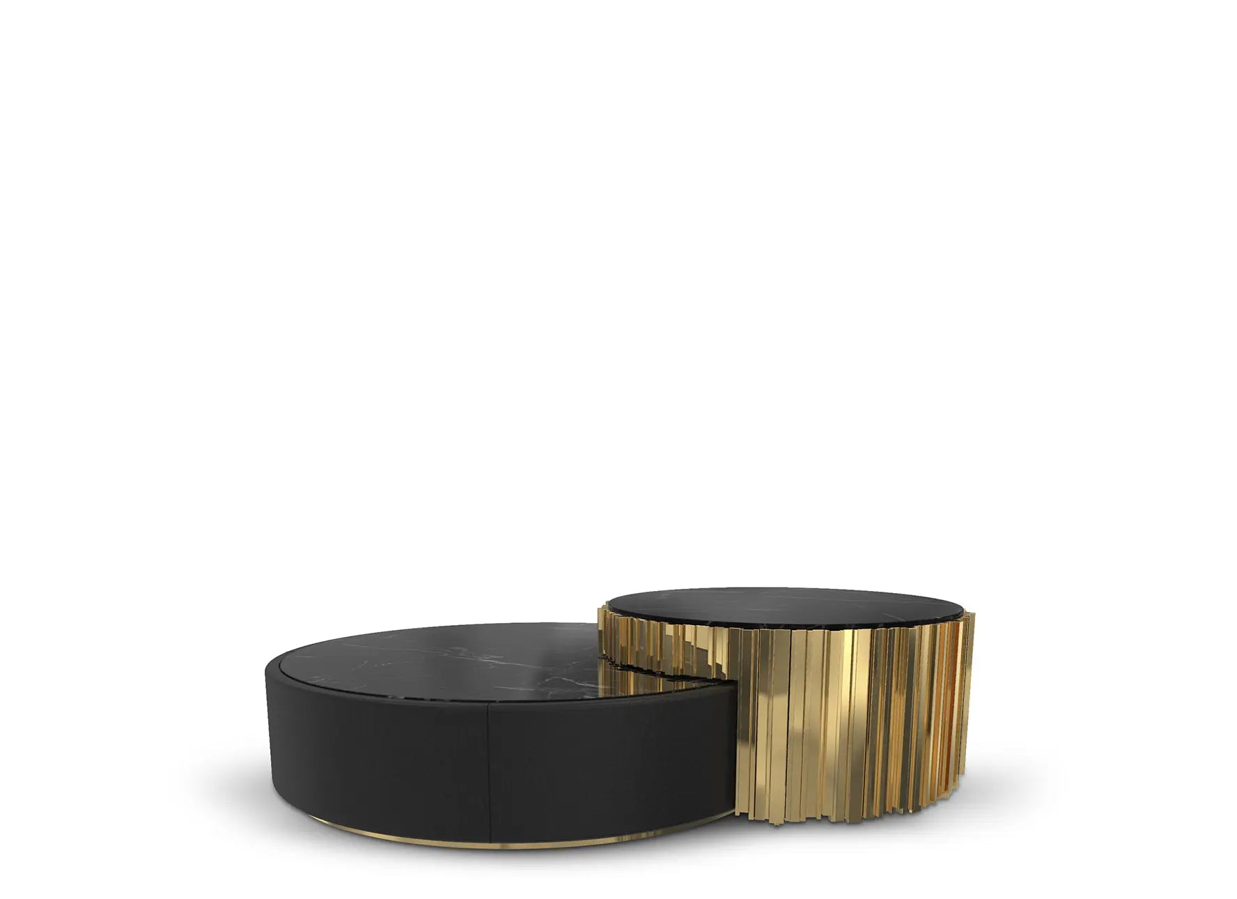 The iconic lines of the Empire Collection have inspired yet another creation, the Empire Center Table I. A modular two-piece round table made with bronze brass, Emperador dark marble, and Nata Elastron leather. Glamorous and charming, this product is designed to become a somber and more modern version of the usual gold and glass aesthetics of the Empire collection. Just perfect to decorate like royalty.