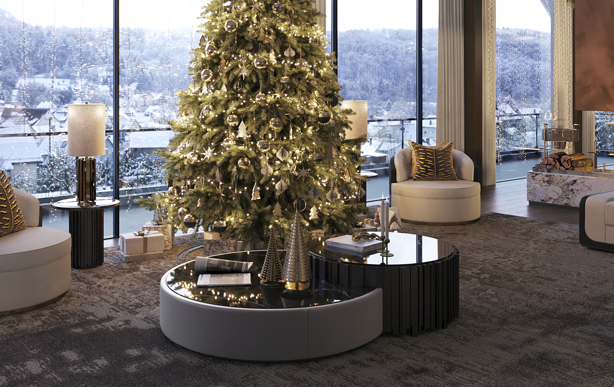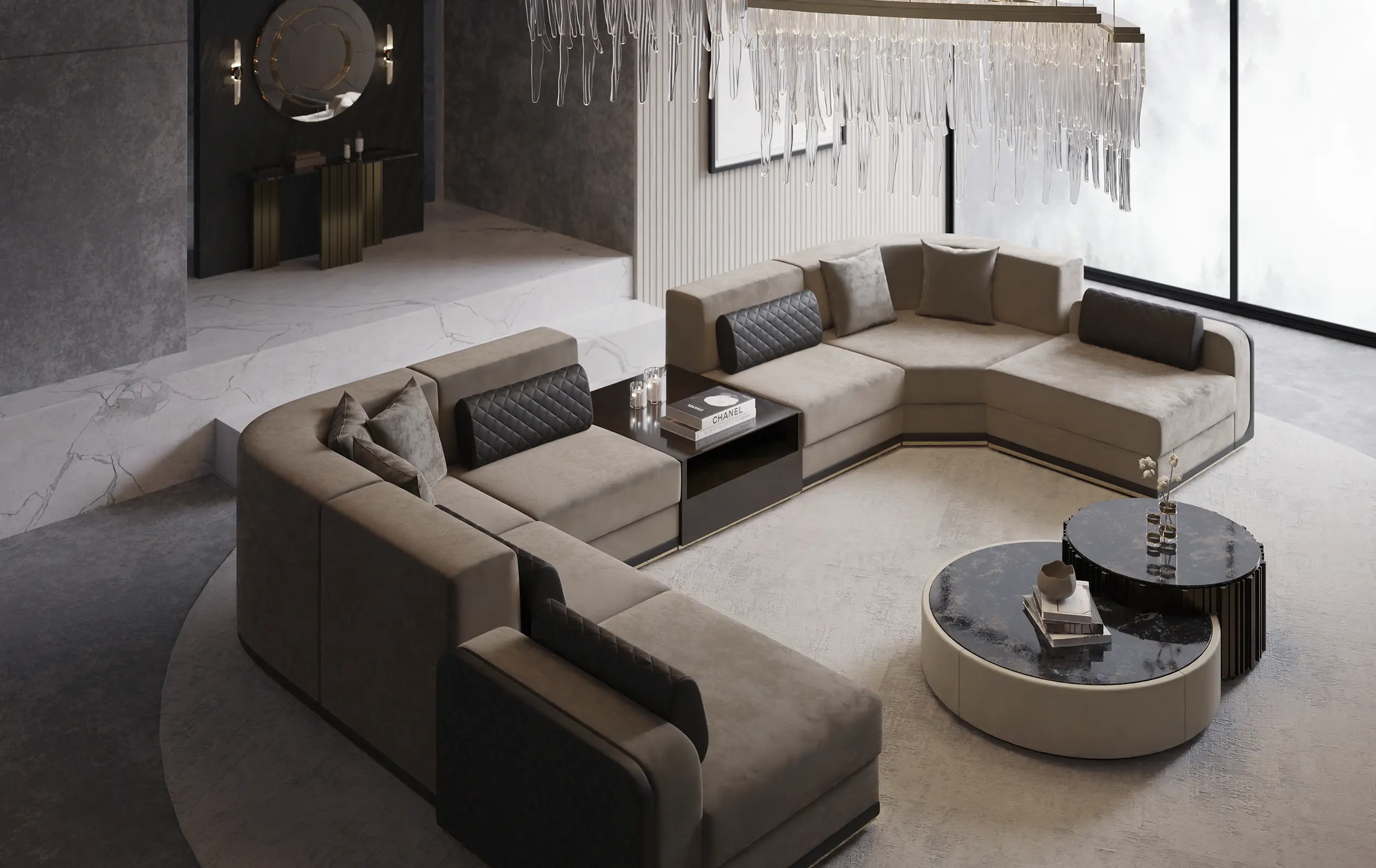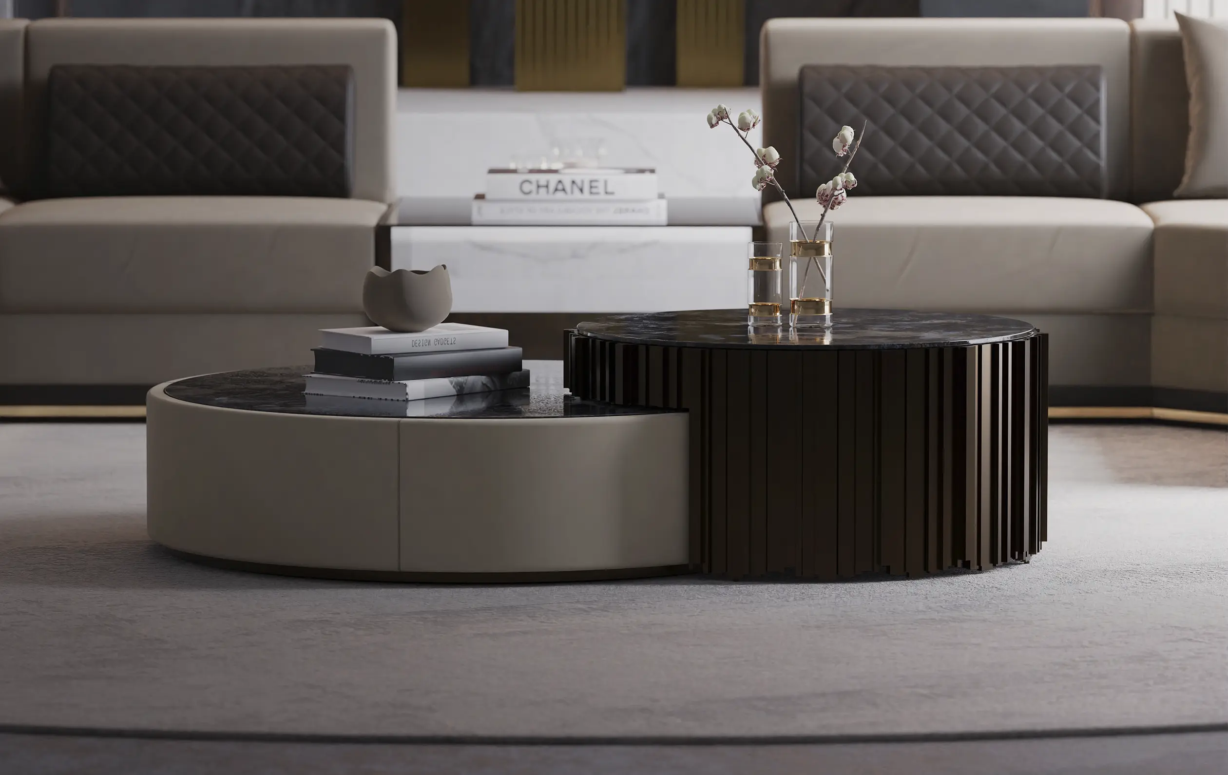 The iconic lines of the Empire Collection have inspired yet another creation, the Empire Center Table I. A modular two-piece round table made with bronze brass, Emperador dark marble, and Nata Elastron leather. Glamorous and charming, this product is designed to become a somber and more modern version of the usual gold and glass aesthetics of the Empire collection. Just perfect to decorate like royalty.