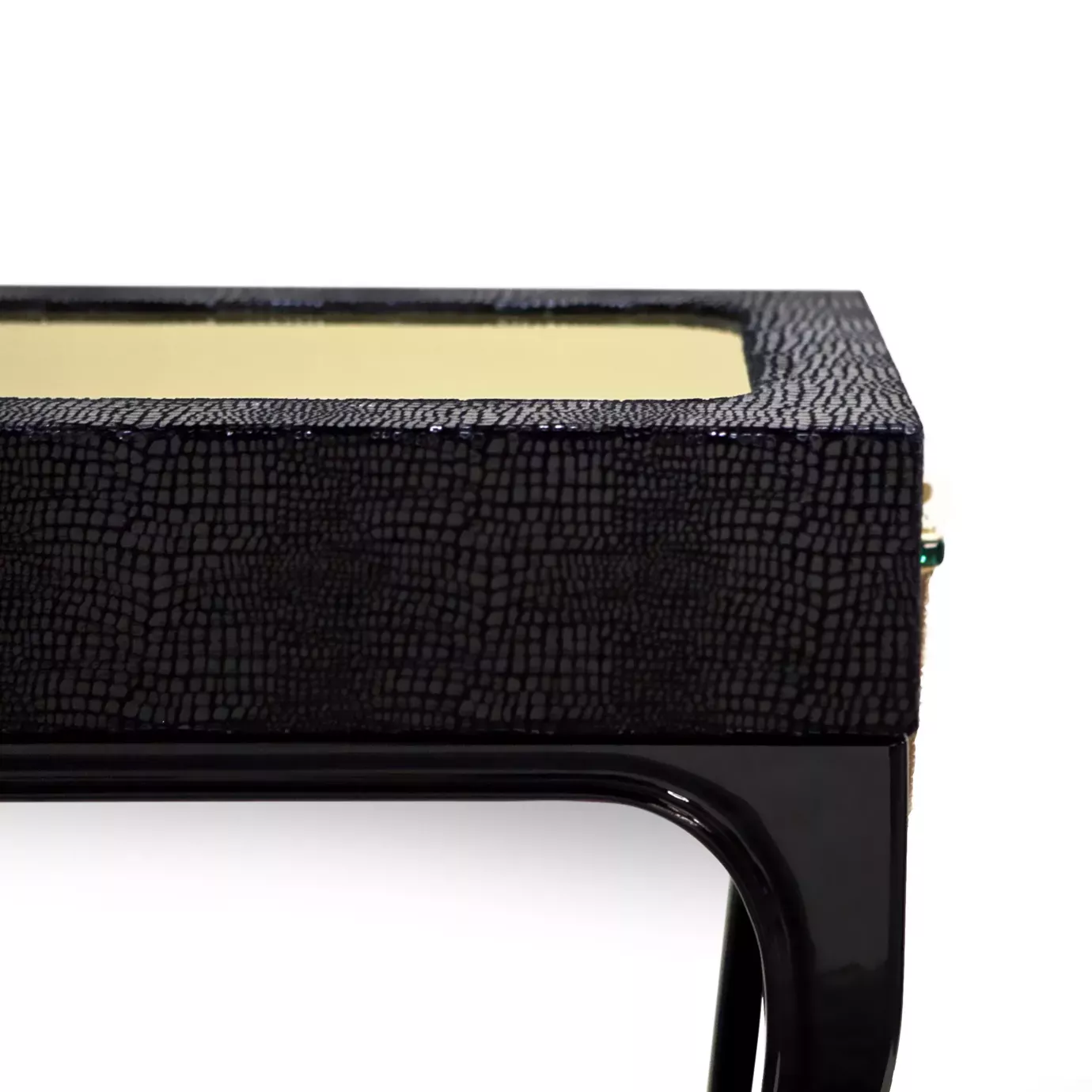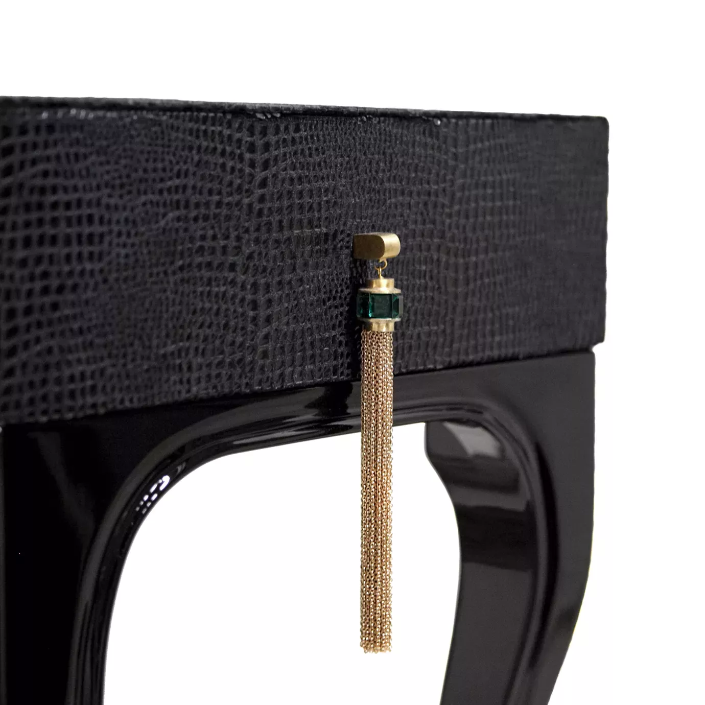 Drawer Fronts: Iridiscent Lux Python Fabric from the KOKET Textiles collection and Polished Brass (High Gloss Finish)