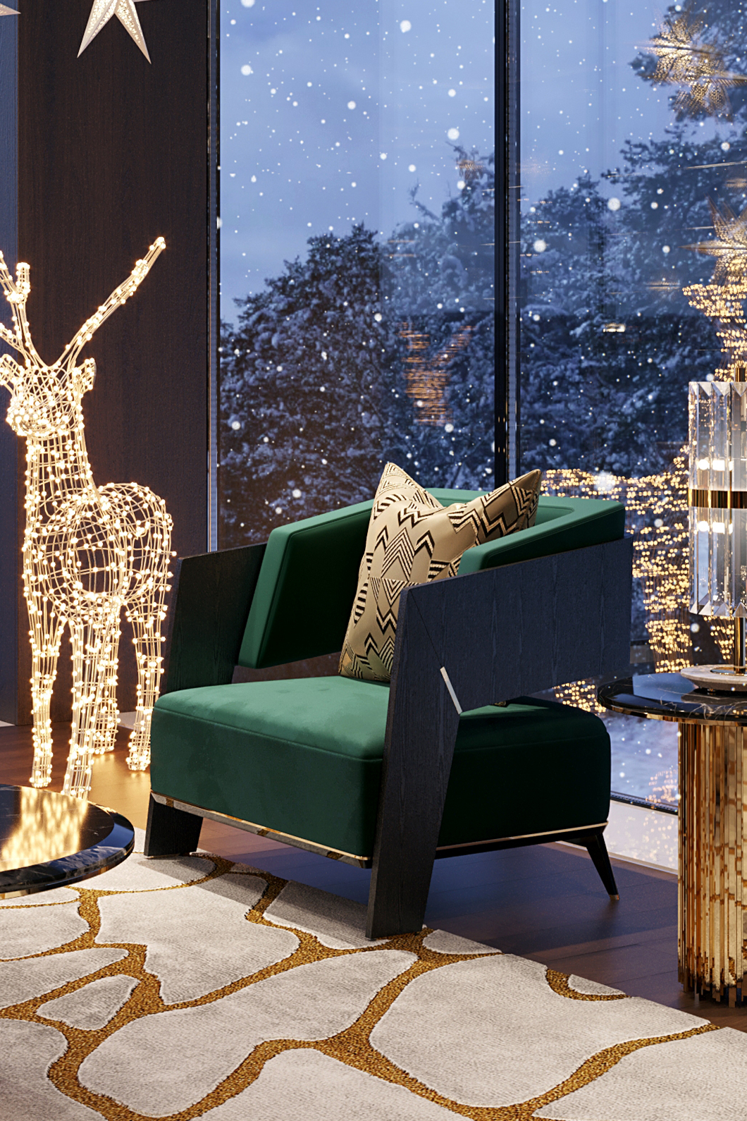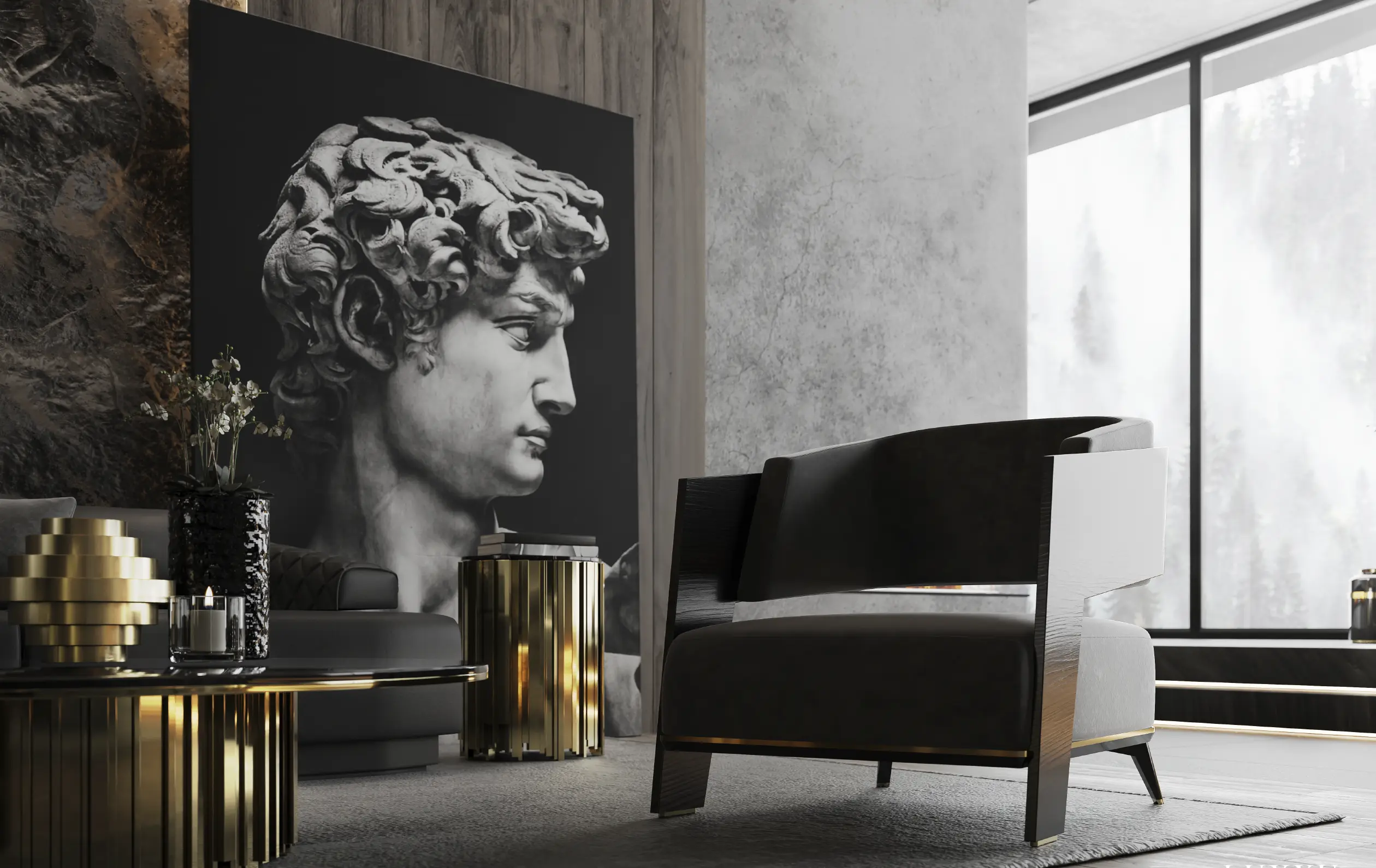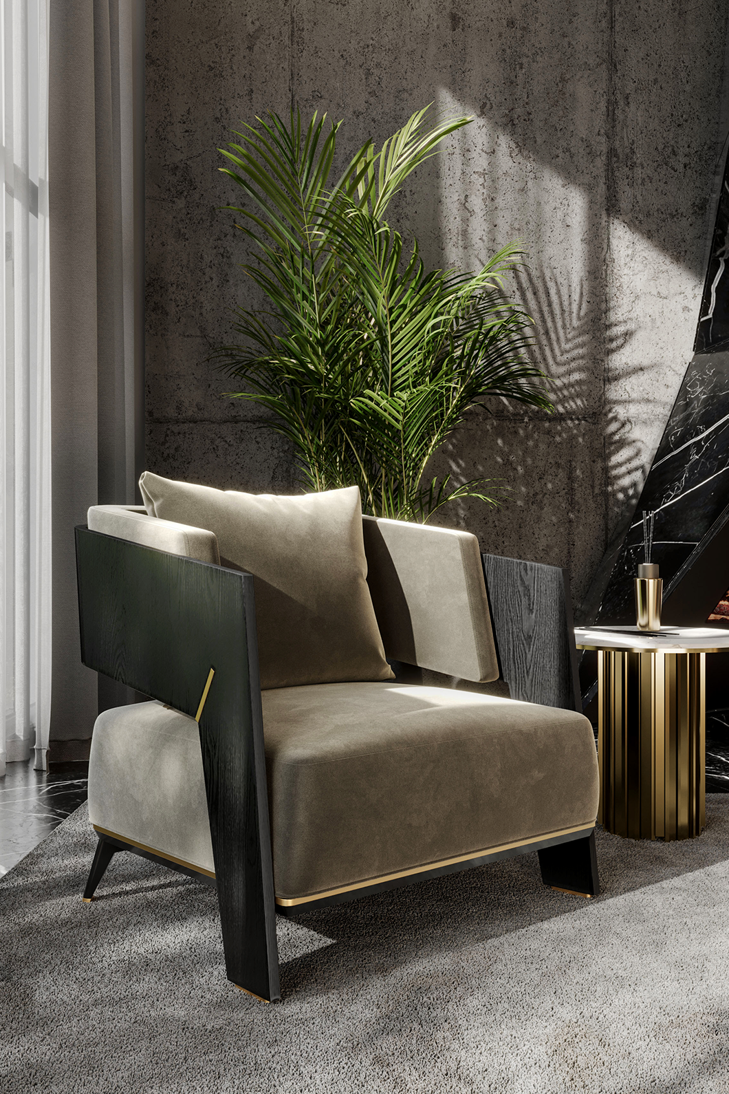 Body: Polished brass, Black oak leaf, black lacquer & grey velvet