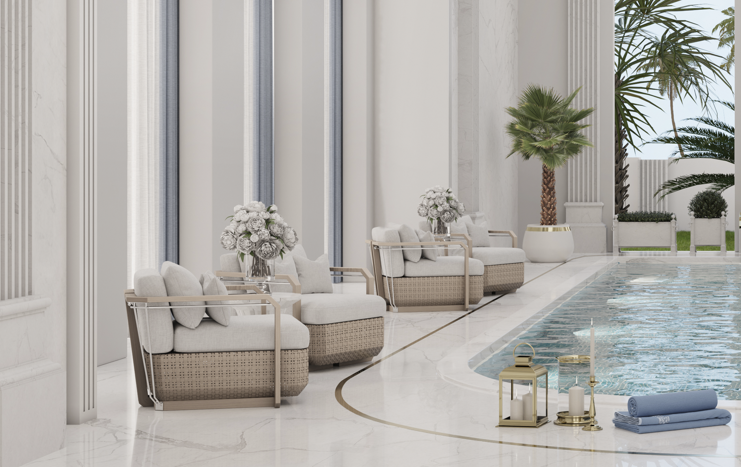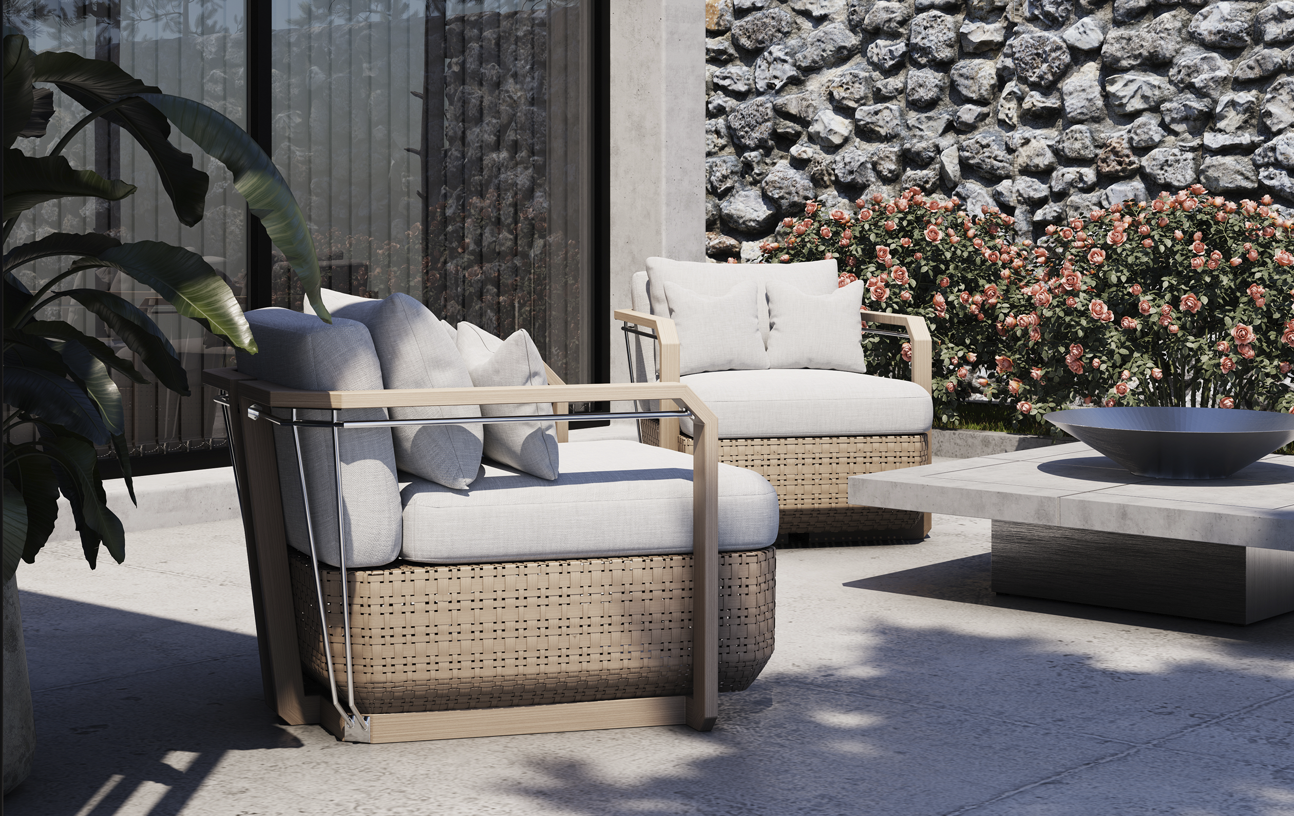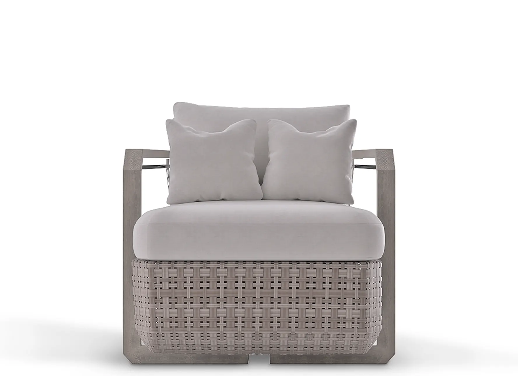 Inspired by prestigious holiday destinations, the Hampton Wood Outdoor Armchair flawlessly combines elegance and durability. Made from vintage wood, polished steel, weaving Seashell, and Nata fabric, it enhances any patio, terrace, or pool area with its modern aesthetic.