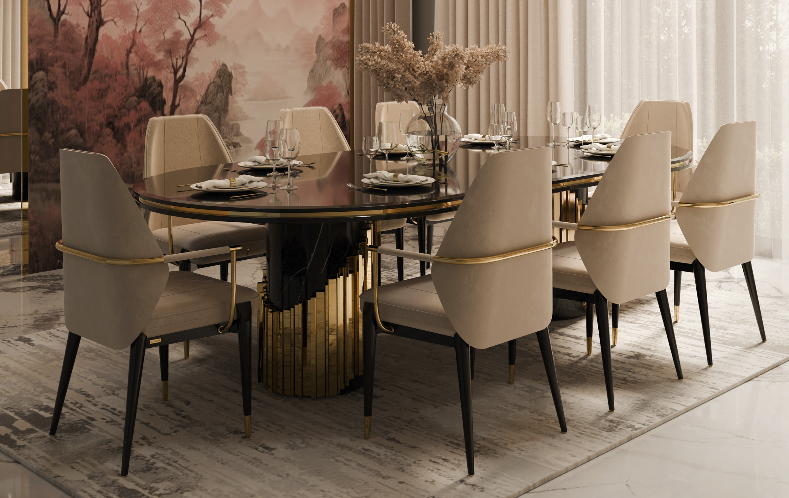 Experience the alluring charm of the Littus Oval Dining Table, renowned for its strong style and sculptural elegance. This modern dining room table showcases the unparalleled artistry of LUXXU's craftsmanship. With polished brass, black lacquer, and Nero Marquina marble, it is a true masterpiece of luxury and sophistication for any interior decor style.