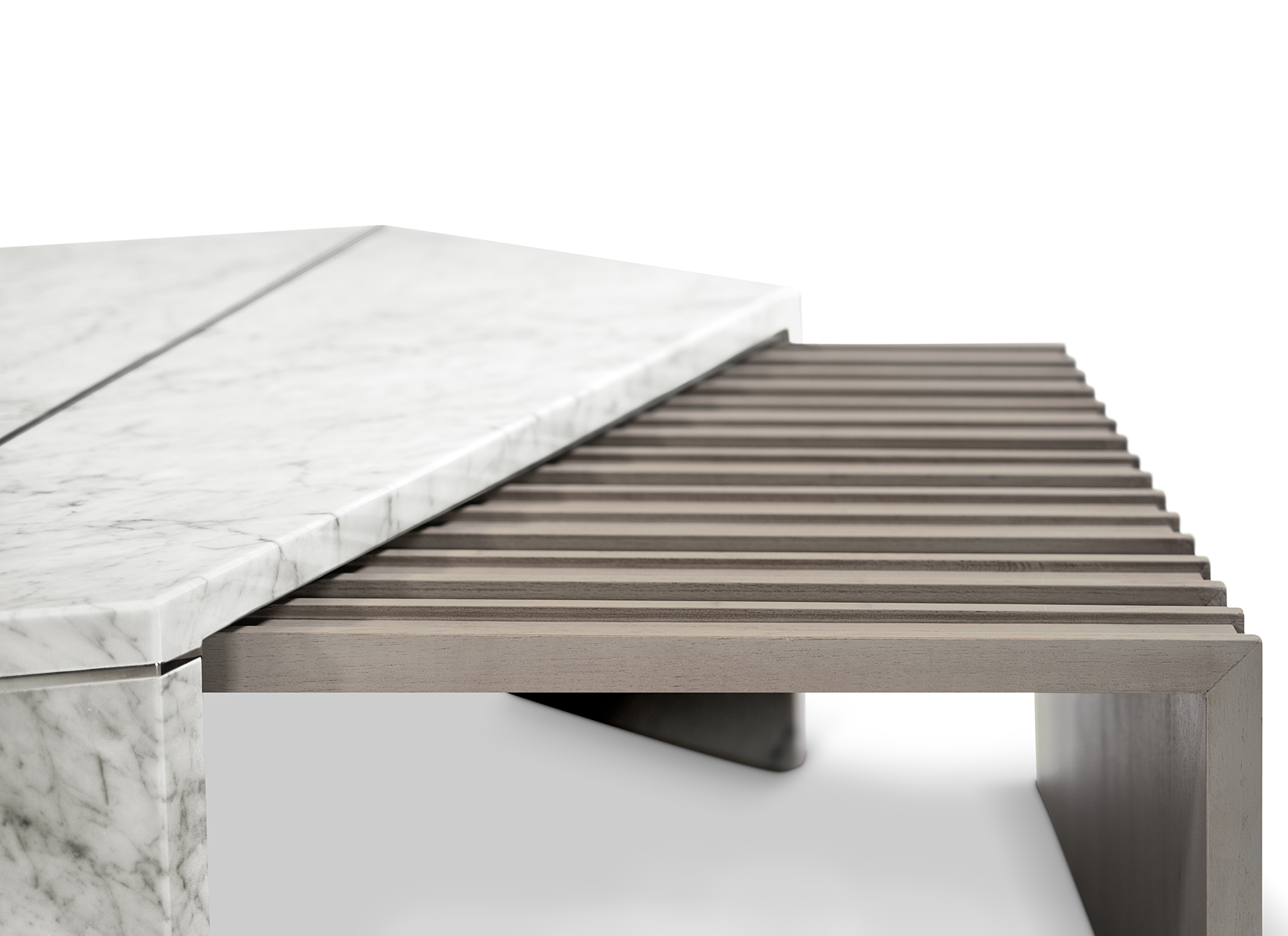 The Mayer Wood Center Table is a modern masterpiece crafted from vintage wood, polished stainless steel, and Carrara marble. This exquisite piece represents the epitome of modern outdoor design by combining premium materials and sleek aesthetics. It's an ideal addition for outdoor lounge areas, rooftops, or poolside spaces, making it the centerpiece of any decor.