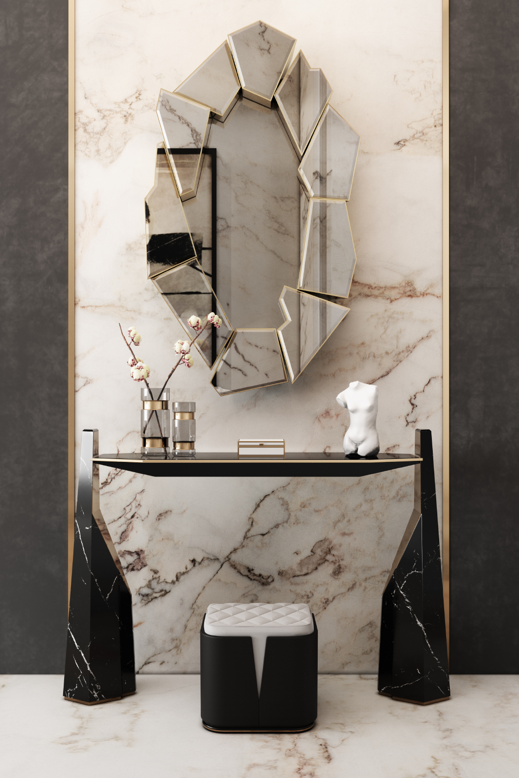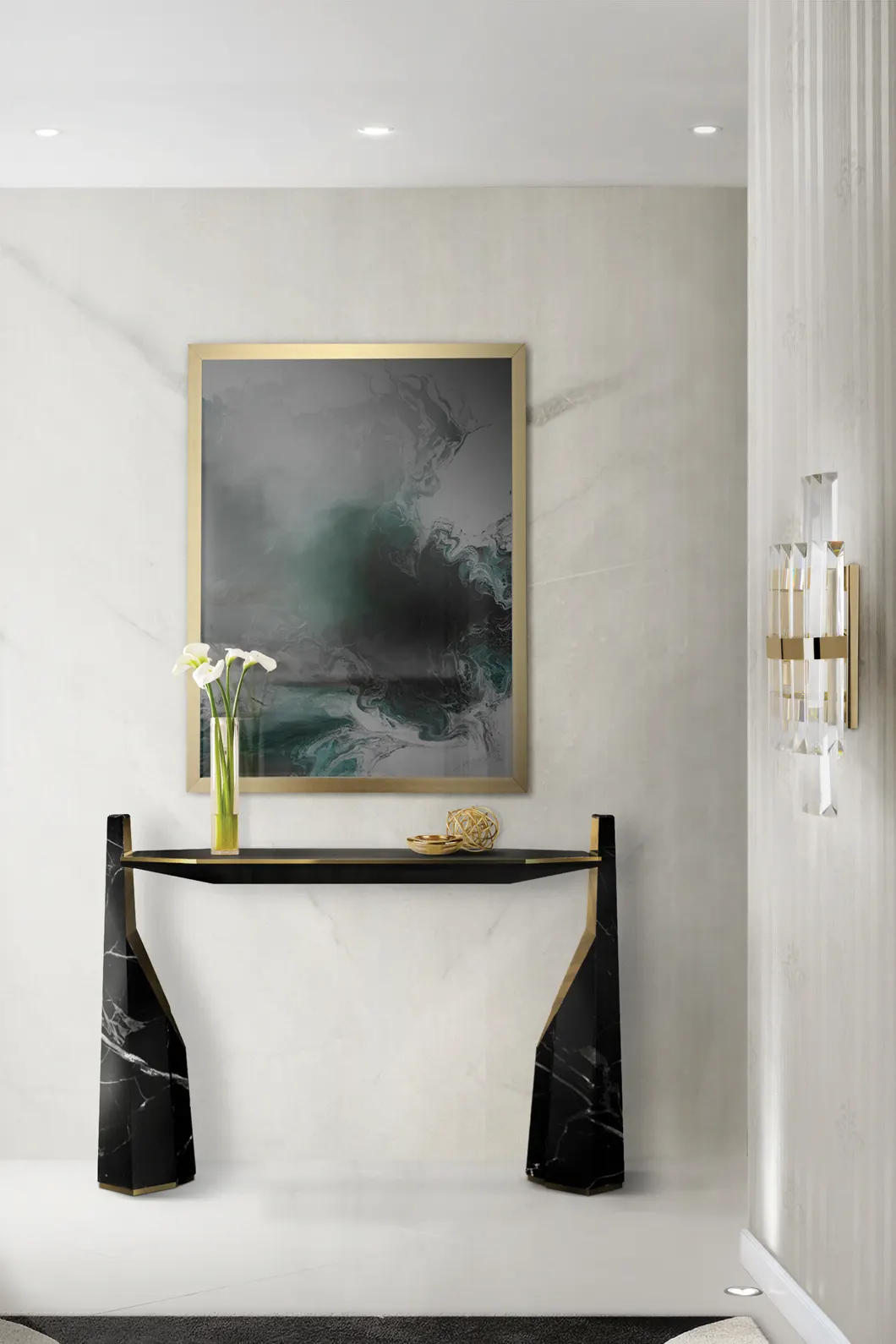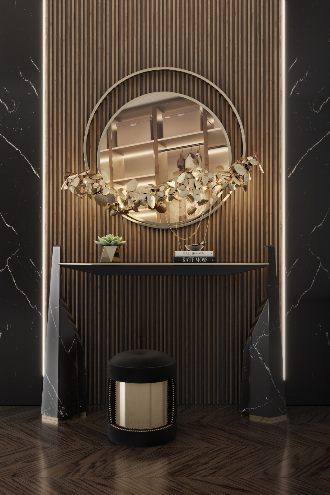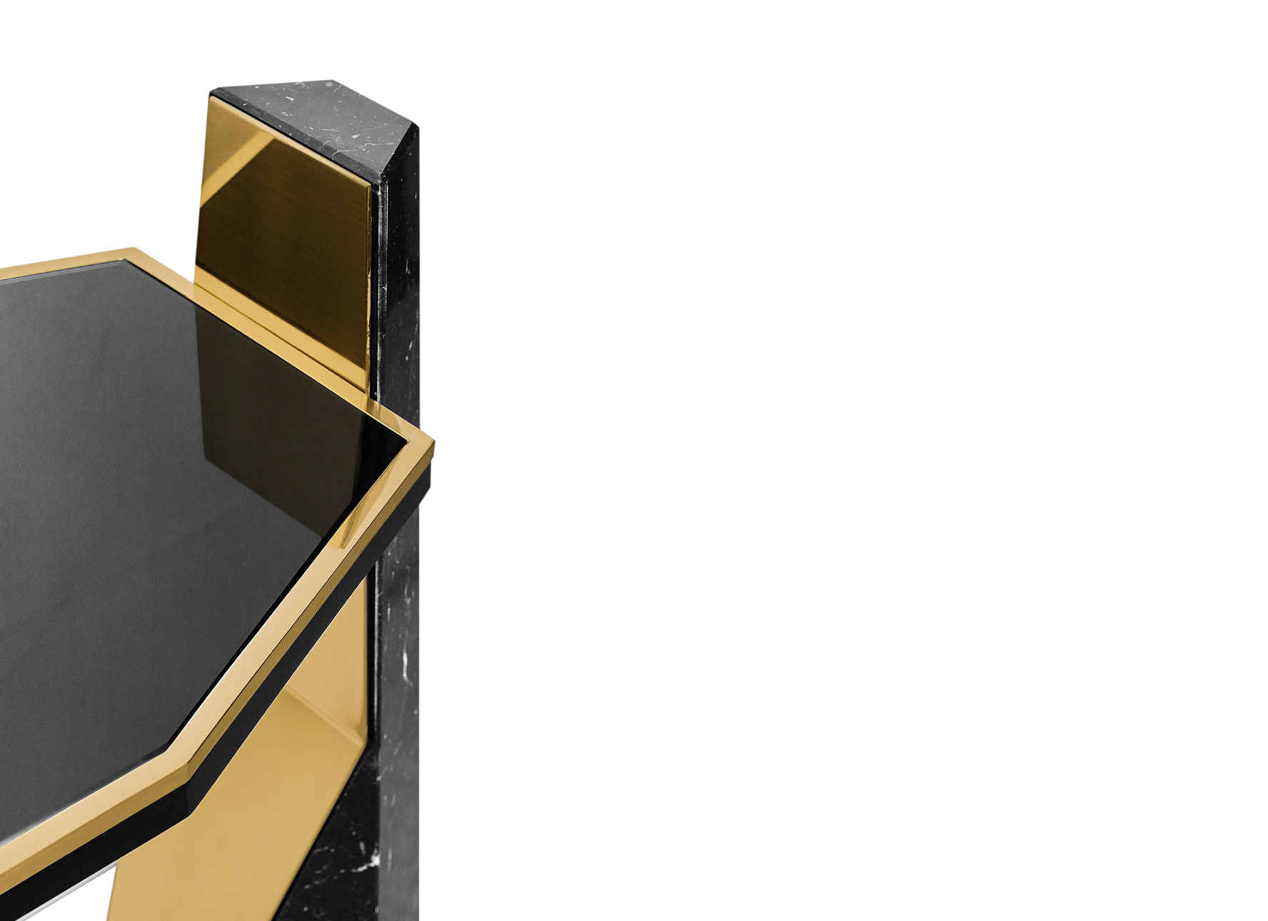 The Myllo console is an innovative design symbol that showcases artistry and functionality. Its versatile composition, which ranges from Nero Marquina marble to polished brass, creates a striking contrast. Designed with a bridge-like structure, Myllo draws inspiration from contemporary architecture, highlighting a bold figure and an avant-garde aesthetic. This statement piece embodies structural ingenuity and timeless elegance