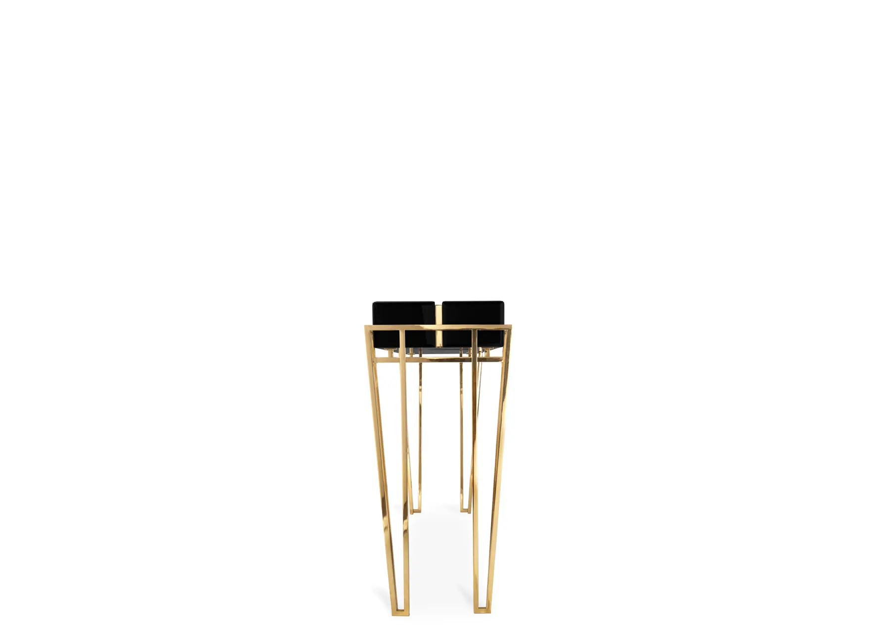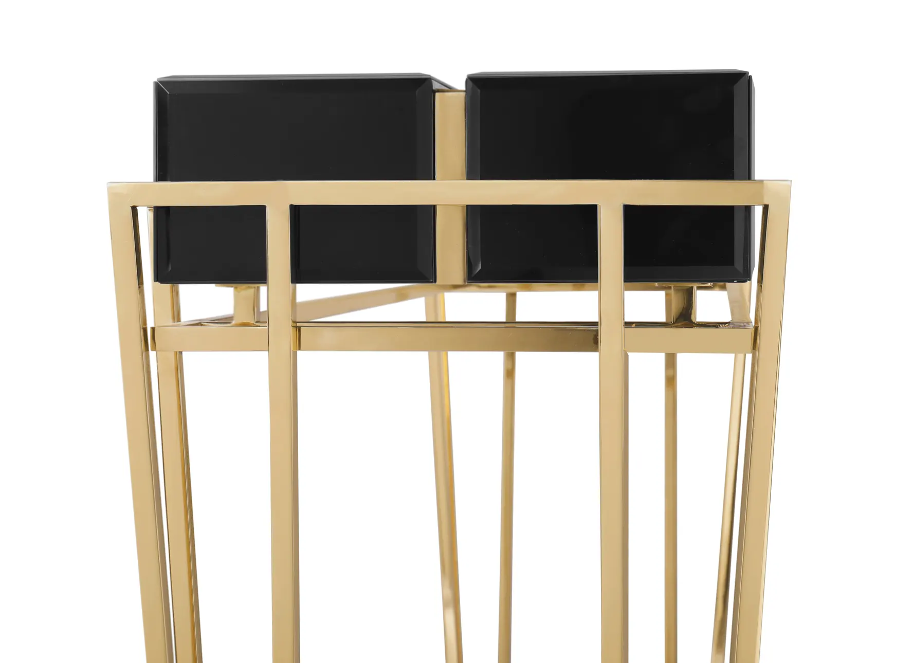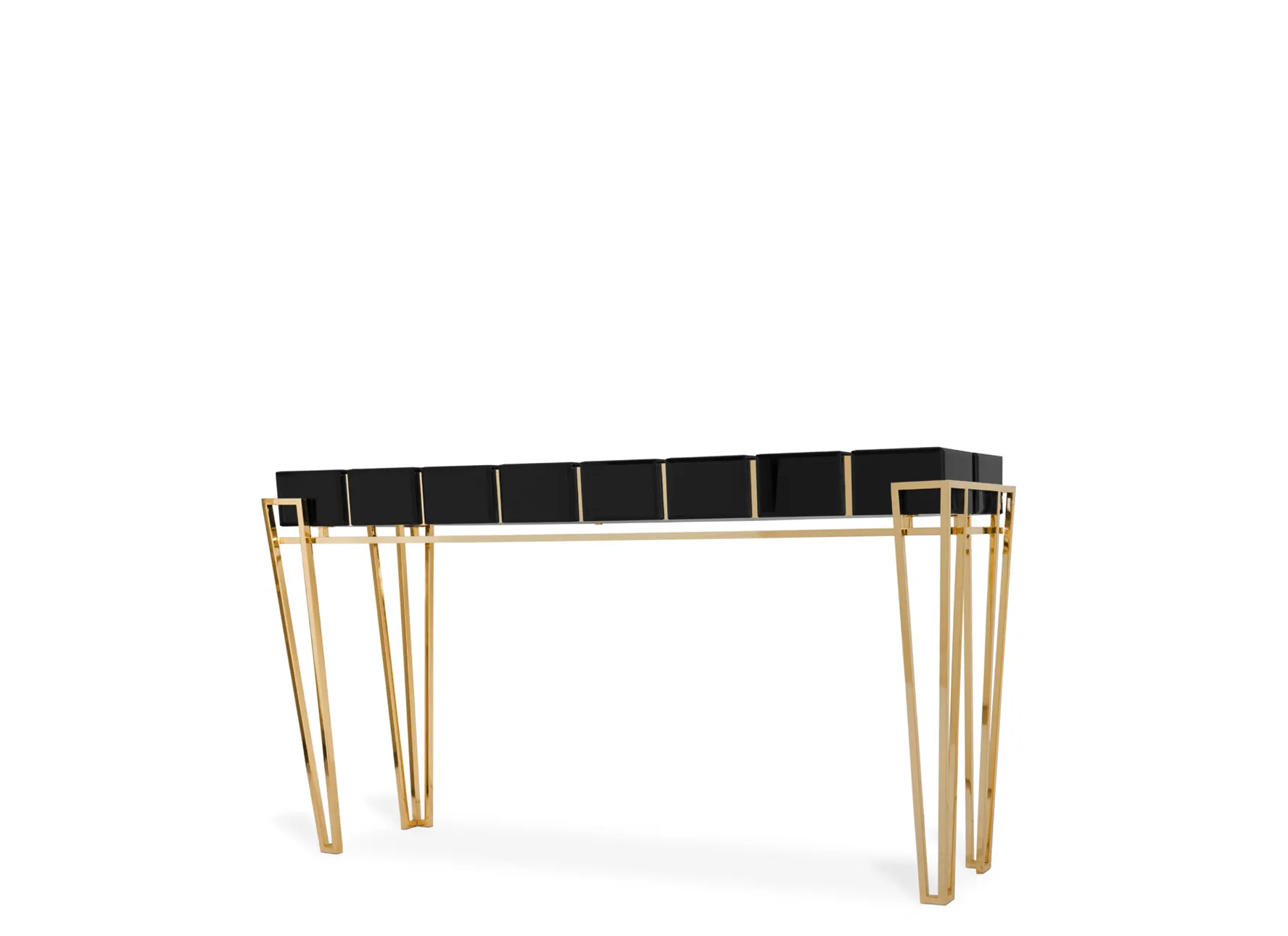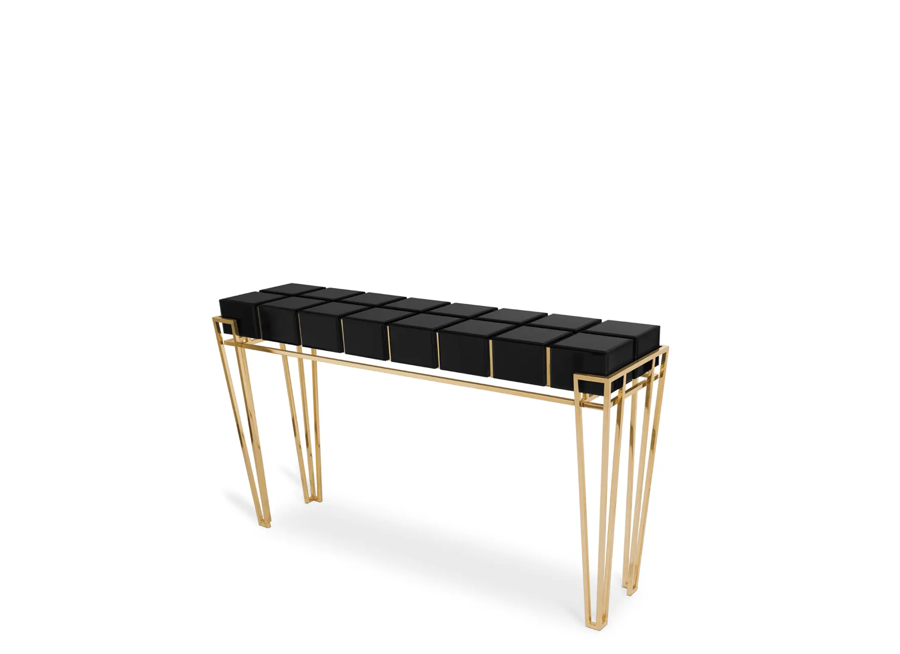 The glorious geometrical construction of the Nubian pyramids has resulted in a captivating and contrasting geometric design. This design showcases the complexity of noble materials, including glass, walnut root veneer, and brass. The Nubian Console is an elaborate embodiment of luxury and refined elegance, making it a promising focal point in any setting.