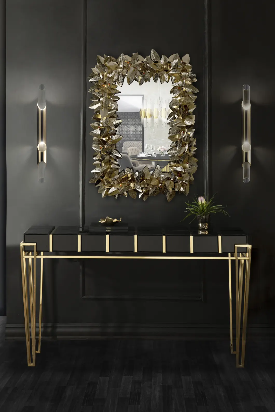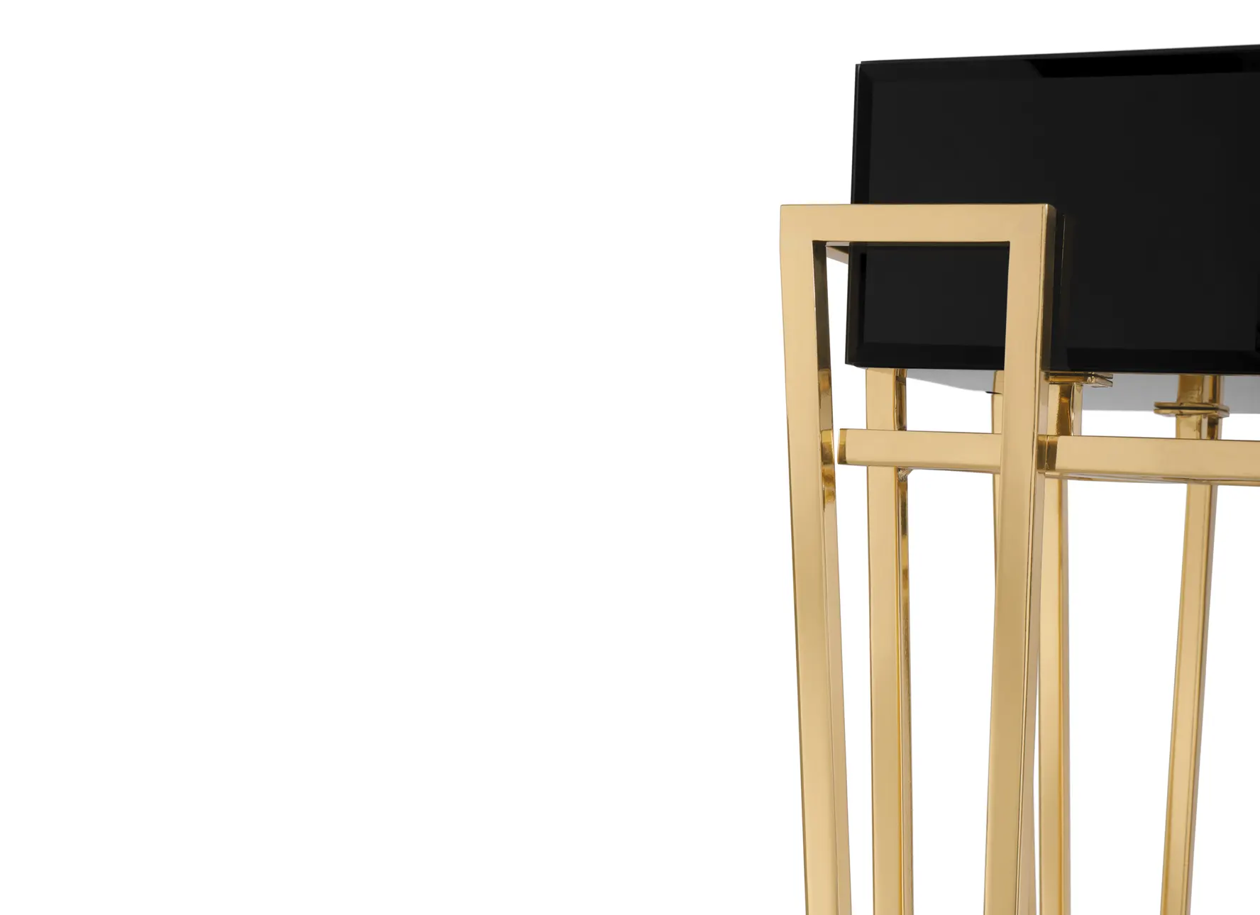 Body: Polished brass, Black glass, Black lacquer & Walnut root veneer