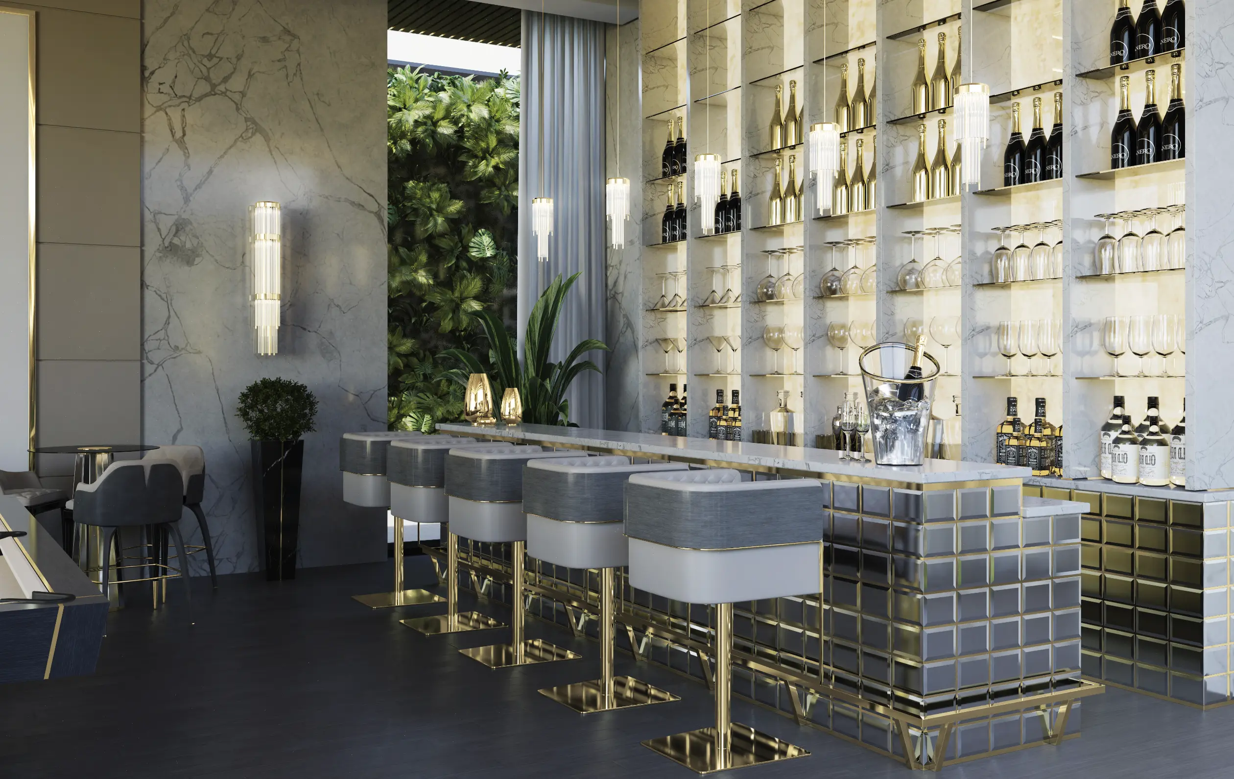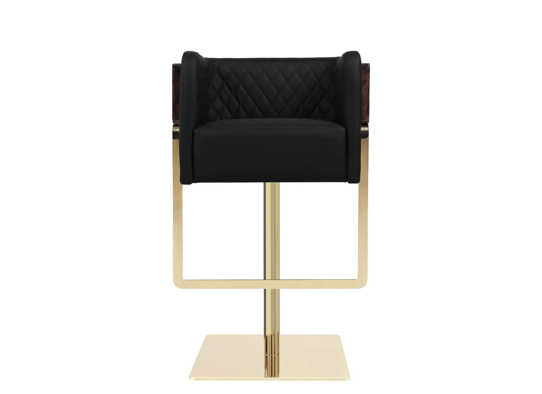 Featuring a uniquely shaped backrest, the Nura Swivel Bar Chair embodies the perfect blend of comfort and luxury. With its swivel feature, this chair offers exclusive style and exceptional comfort. Crafted from leather, brass, and wood, it adds a touch of glam and coziness to high-end bars seeking a sophisticated ambiance.