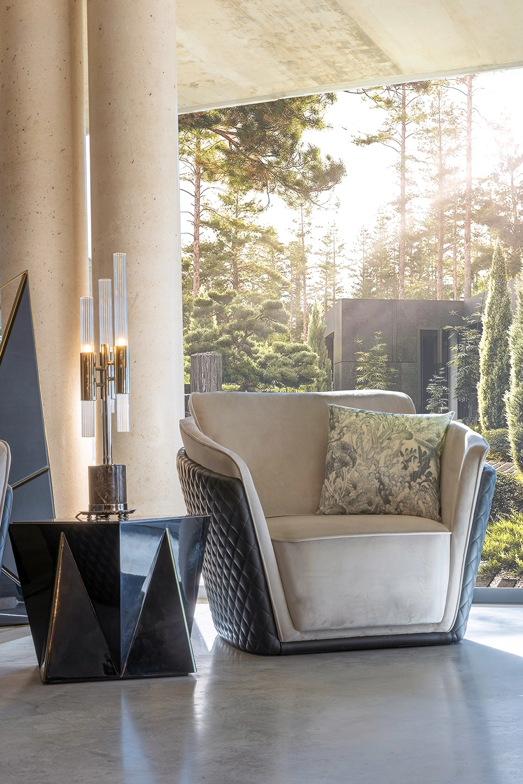 The lavish character of seats in opera houses inspired this single sofa, which captures the best of modern design and luxurious living. With simple lines, soft velvet upholstery, and a leather panel in the back, this sofa is both comfortable and stylish. It is customizable in a wide range of colors to suit any interior.