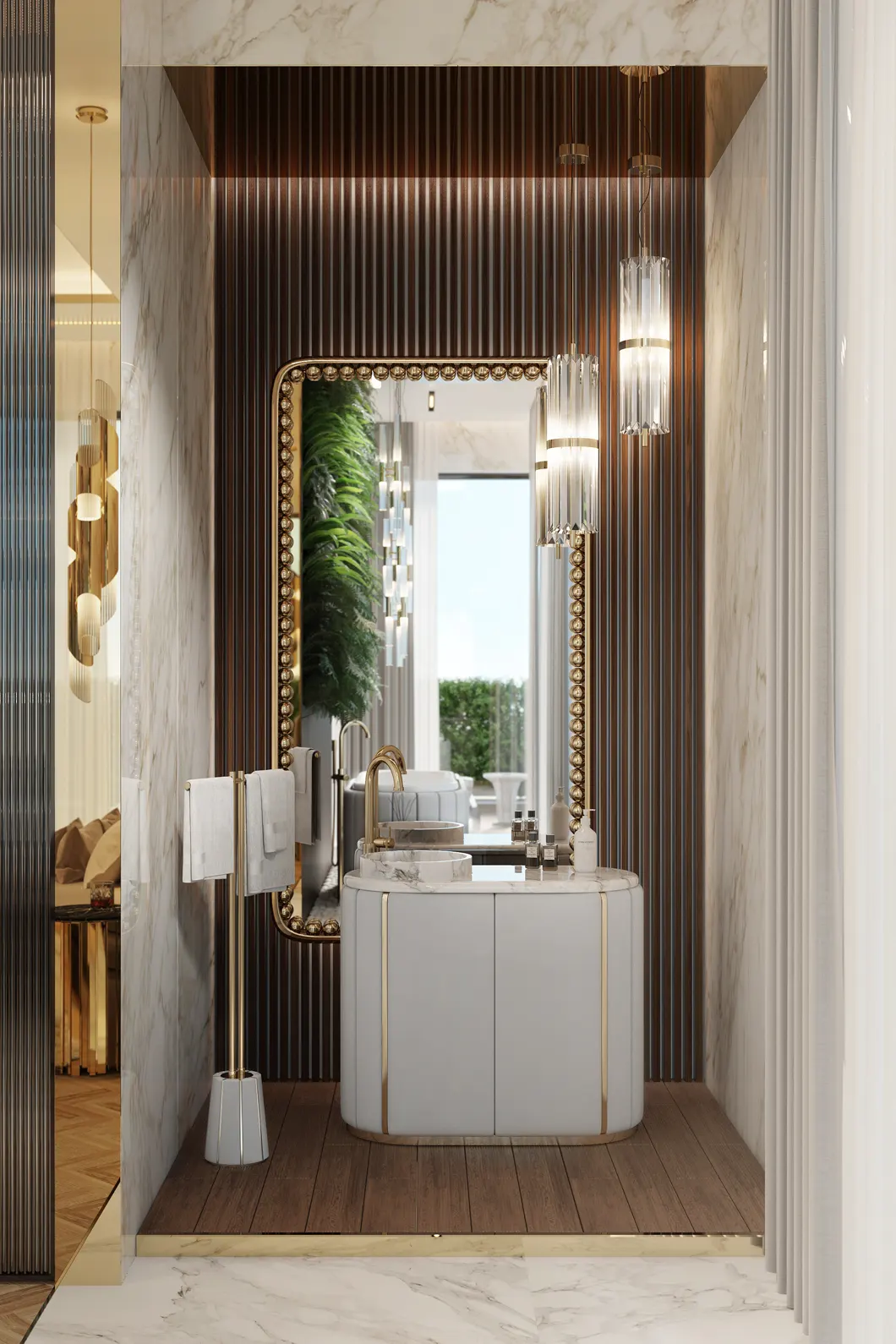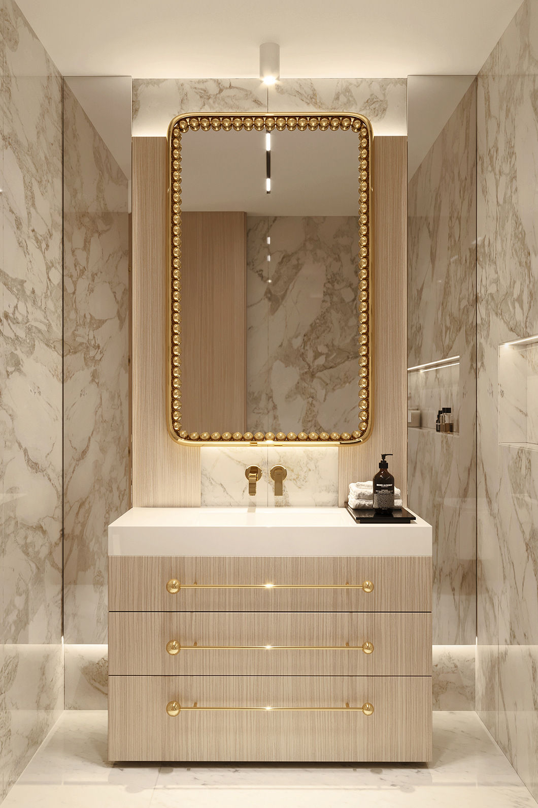 Orbis is an elegant mirror with a rectangular shape. The detailed frame, which is decorated with small golden spheres, is made of gold-plated brass and brings a modern touch to this timeless design. Stylish and glamorous, this luxury mirror can be hung vertically or horizontally, depending on your needs.