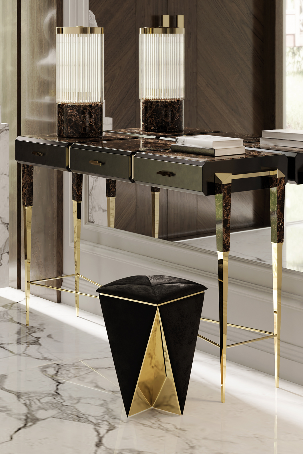 Body: Polished brass, Black Lacquer, Black leather & Grey Synthetic Leather
