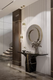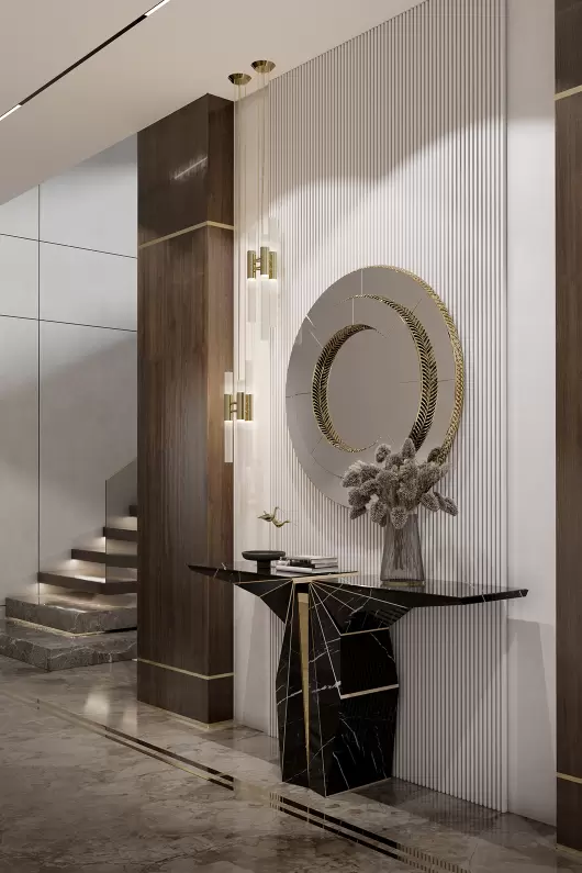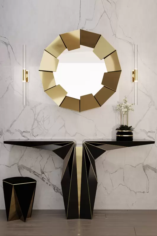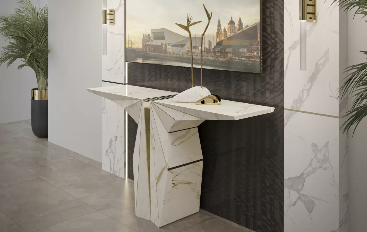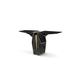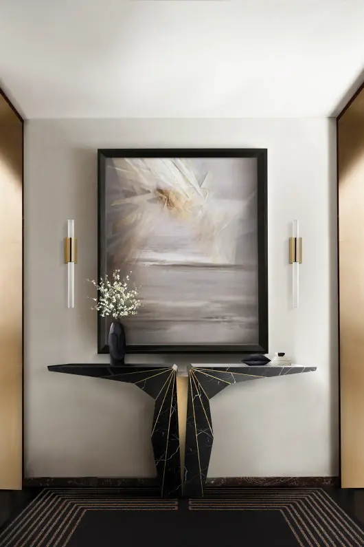 The Suspicion Console is the zenith of elegance and balance, expertly sculpted in stone to fill any room with lavish luxury. This marble console table exemplifies intricate equilibrium, seamlessly merging Nero Marquina marble and Amarillo Triana marble with polished brass lines. It's the perfect console table for a luxurious hotel lobby or a memorable entryway.